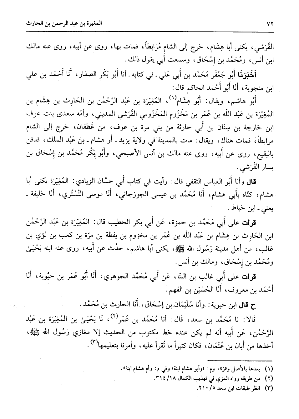 القرشي يكنى أبا هشام خرج إلى الشام مرابطا فمات بها روى عن أبيه روى عنه مالك ابن أنس ومحمد بن إسحاق وسمعت أبي يقول ذلك أخبرنا أبو جعفر محمد بن أبي علي في كتابه أنا أبو بكر الصفار أنا أحمد بن علي ابن منجوية أنا أبو أحمد الحاكم قال أبو هاشم ويقال أبو هشام (1) المغيرة بن عبد الرحمن بن الحارث بن هشام بن المغيرة بن عبد الله بن عمر بن مخزوم المخزومي القرشي المديني وأمه سعدى بنت عوف ابن خارجة بن سنان بن أبي حارثة من بني مرة بن عوف من غطفان خرج إلى الشام مرابطا فمات هناك ويقال مات بالمدينة في ولاية يزيد أو هشام بن عبد الملك فدفن بالبقيع روى عن أبيه روى عنه مالك بن أنس الأصبحي وأبو بكر محمد بن إسحاق بن يسار القرشي قال وأنا أبو العباس الثقفي قال رأيت في كتاب أبي حسان الزيادي المغيرة يكنى أبا هشام كناه بأبي هشام أنا محمد بن عيسى الجوزجاني أنا موسى التستري أنا خليفة يعني ابن خياط قرأت على أبي محمد بن حمزة عن أبي بكر الخطيب قال المغيرة بن عبد الرحمن ابن الحارث بن هشام بن عبد الله بن عمر بن مخزوم بن يفظة بن مرة بن كعب بن لؤي بن غالب من أهل مدينة رسول الله (صلى الله عليه وسلم) يكنى أبا هاشم حدث عن أبيه روى عنه ابنه يحيى ومحمد بن إسحاق ومالك بن أنس قرأت على أبي غالب بن البنا عن أبي محمد الجوهري أنا أبو عمر بن حيوية أنا أحمد بن معروف أنا الحسين بن الفهم ح قال ابن حيوية وأنا سليمان بن إسحاق أنا الحارث بن محمد قالا نا محمد بن سعد قال أنا محمد بن عمر (2) نا يحيى بن المغيرة بن عبد الرحمن عن أبيه أنه لم يكن عنده خط مكتوب من الحديث إلا مغازي رسول الله (صلى الله عليه وسلم) أخذها من أبان بن عثمان فكان كثيرا ما تقرأ عليه وأمرنا بتعليمها (3)