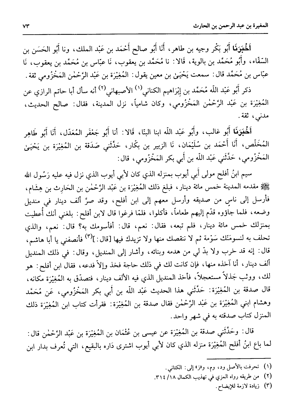 أخبرنا أبو بكر وجيه بن طاهر أنا أبو صالح أحمد بن عبد الملك ونا أبو الحسن بن السقاء وأبو محمد بن بالوية قالا نا محمد بن يعقوب نا عباس بن محمد بن يعقوب نا عباس بن محمد قال سمعت يحيى بن معين يقول المغيرة بن عبد الرحمن المخزومي ثقة ذكر أبو عبد الله محمد بن إبراهيم الكناني (1) الأصبهاني (2) أنه سأل أبا حاتم الرازي عن المغيرة بن عبد الرحمن المخزومي وكان شاميا نزل المدينة فقال صالح الحديث مدني ثقة أخبرنا أبو غالب وأبو عبد الله ابنا البنا قالا أنا أبو جعفر المعدل أنا أبو طاهر المخلص أنا أحمد بن سليمان نا الزبير بن بكار حدثني صدقة بن المغيرة بن يحيى المخزومي حدثني عبد الله بن أبي بكر المخزومي قال سيم ابن أفلح مولى أبي أيوب بمنزله الذي كان لأبي أيوب الذي نزل فيه عليه رسول الله (صلى الله عليه وسلم) مقدمه المدينة خمس مائة دينار فبلغ ذلك المغيرة بن عبد الرحمن بن الحارث بن هشام فأرسل إلى ناس من صديقه وأرسل معهم إلى ابن أفلح وقد صر ألف دينار في منديل وضعه فلما جاؤوه قدم إليهم طعاما فأكلوا فلما فرغوا قال لابن أفلح بلغني أنك أعطيت بمنزلك خمس مائة دينار فلم تبعه فقال نعم قال أفأسومك به قال نعم والذي تحلف به لنسومنك سومة ثم لا ننقصك منها ولا تزيدك فيها قال (3) فأنصفني يا أبا هاشم قال إنه قد خرب ولا بد لي من هدمه وبنائه وأشار إلى المنديل وقال في ذلك المنديل ألف دينار أنا آخذه منها فإن كانت لك في ذلك حاجة فخذ وإلا فدعه فقال ابن أفلح هو لك ووثب جذلا مستعجلا فأخذ المنديل الذي فيه الألف دينار فتصدق به المغيرة مكانه قال صدقة بن المغيرة حدثني هذا الحديث عبد الله بن أبي بكر المخزومي عن محمد وهشام ابني المغيرة بن عبد الرحمن فقال صدقة بن المغيرة فقرأت كتاب ابن المغيرة ذلك المنزل كتاب صدقته به في شهر واحد قال وحدثني صدقة بن المغيرة عن عيسى بن عثمان بن المغيرة بن عبد الرحمن قال لما باع ابن أفلح المغيرة منزله الذي كان لأبي أيوب اشترى داره بالبقيع التي تعرف بدار ابن