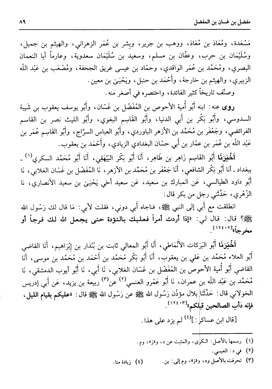 [12402] أخبرنا أبو البركات الأنماطي أنا أبو المعالي ثابت بن بندار بن إبراهيم أنا القاضي أبو العلاء محمد بن علي بن يعقوب أنا أبو بكر محمد بن أحمد بن محمد بن موسى أنا القاضي أبو أمية الأحوص بن المفضل بن غسان الغلابي نا أبي نا أبو أيوب الدمشقي نا محمد بن عبد الله بن عمران نا أبو عمرو العنسي (2) عن (3) ربيعة بن يزيد عن أبي إدريس الخولاني قال حدثنا بلا مؤذن رسول الله (صلى الله عليه وسلم) عن رسول الله (صلى الله عليه وسلم) قال عليكم بقيام الليل فإنه دأب الصالحين قبلكم