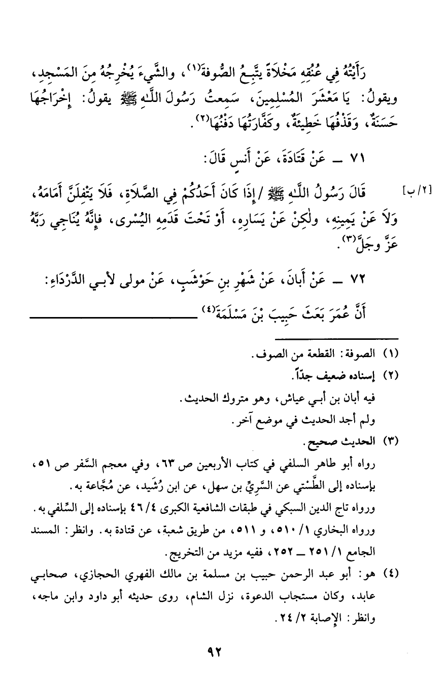 ٧٣ - عن أبان عَنْ أَنَسِ قَالَ قَالَ رَسُولُ اللَّهِ صَلَّى الله عليه وسلم إياك والالتفات في الصلاة فإن الالتفات في الصلاة هلكة فإن كان لا بد ففي التطوع لا في الفريضة.