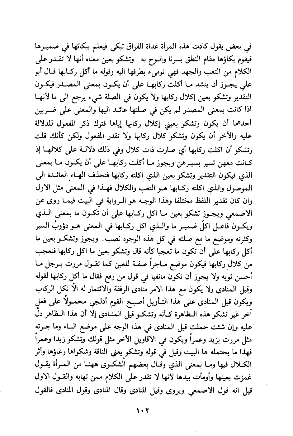 في بعض يقول كادت هذه المرأة غداة الفراق تبكي فيعلم ببكائها في ضميرها فيقوم بكاؤها مقام النطق بسرنا والبوح به وتشكو بعين معناه أنها لا تقدر على الكلام من التعب والجهد فهي تومئ بطرفها إليه وقوله ما أكل ركابها قال أبو علي يجوز أن ينشد ما أكلت ركابها على أن يكون بمعنى المصدر فيكون التقدير وتشكو بعين إكلال ركابها ولا يكون في الصلة شيء يرجع إلى ما لأنها إذا كانت بمعنى المصدر لم يكن في صلتها عائد إليها والمعنى على ضربين أحدهما أن يكون وتشكو بعيني إكلال ركابها إياها فترك ذكر المفعول للدلالة عليه والآخر أن يكون وتشكو كلال ركابها ولا تقدر المفعول ولكن كأنك قلت وتشكو أن أكلت ركابها أي صارت ذات كلال وفي ذلك دلالة على كلالها إذ كانت معهن تسير بسيرهن ويجوز ما أكلت ركابها على أن يكون ما بمعنى الذي فيكون التقدير وتشكو بعين الذي أكلته ركابها فتحذف الهاء العائدة إلى الموصول والذي أكلته ركابها هو التعب والكلال فهذا في المعنى مثل الأول وإن كان تقدير اللفظ مختلفا وهذا الوجه هو الرواية في البيت فيما روى عن الأصمعي ويجوز تشكو بعين ما أكل ركابها على أن تكون ما بمعنى الذي ويكون فاعل أكلّ ضمير ما والذي أكل ركابها في المعنى هو دؤوت السير وكثرته وموضع ما مع صلته في كل هذه الوجوه نصب. ويجوز وتشكو بعين ما أكل ركابها على أن تكون ما تعجبا كأنه قال وتشكو بعين ما أكل ركابها فتعجب من كلال ركابها فيكون موضع ماجراً صفة للعين كما تقول مررت برجل ما أحسن ثوبه ولا يجوز أن تكون مانفيا في قول من رفع فقال ما أكل ركابها لقوله وقيل المنادى ولا يكون مع هذا الأمر منادى الرفقة والائتمار له إلاّ تكل الركاب ويكون قيل المنادى على هذا التأويل أصبح القوم أدلجي محمولاً على فعلٍ آخر غير تشكو هذه الظاهرة كأنه وتشكو قيل المنادى إلا أن هذا الظاهر دلّ عليه وإن شئت حملت قيل المنادى في هذا الوجه على موضع الباء وما جرته مثل مررت بزيد وعمراً ويكون في الأقاويل الأخر مثل قولك وتشكو زيدا وعمراً فهذا ما يحتمله ها البيت وقيل في قوله وتشكو يعني الناقة وشكواها رغاؤها وأثر الكلال فيها وما بمعنى الذي وقال بعضهم الشكوى ههنا من المرأة يقول غمزت بعينها وأومأت بيدها لأنها لا تقدر على الكلام ممن تهابه والقول الأول قيل أنه قول الأصمعي ويروى وقيل المنادى وقول المنادى فالقول