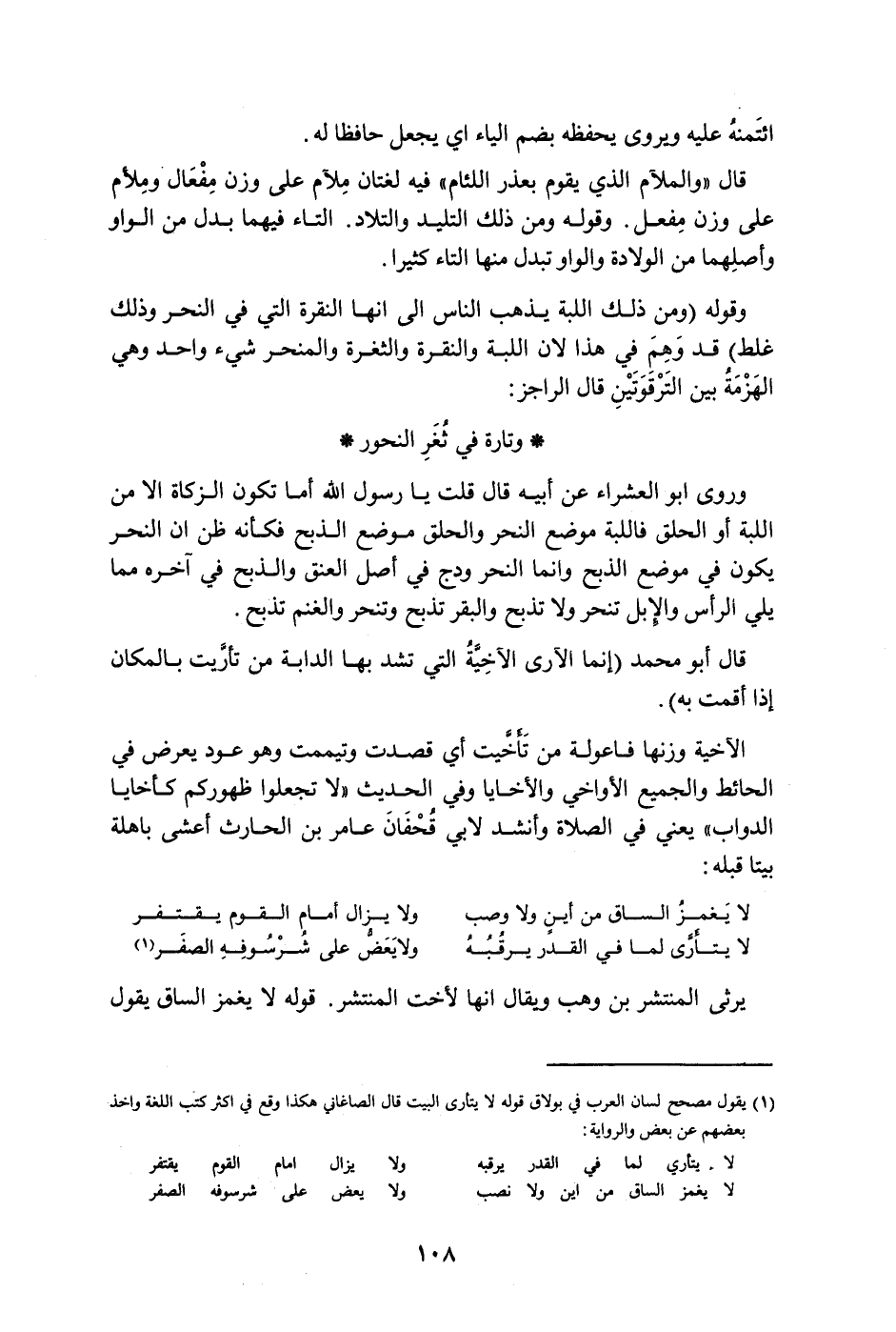 قال أبو محمد " إنما الآرى الآخيّة التي تشد بها الدابة من تأرّيت بالمكان إذا أقمت به ".