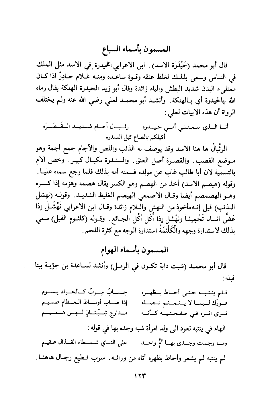 المسمون بأسماء السباع قال أبو محمد " حيدرة الأسد ". ابن الأعرابي الحيدرة في الأسد مثل الملك في الناس وسمى بذلك لغلظ عنقه وقوة ساعده ومنه غلام حادرٌ إذا كان ممتلئ البدن شديد البطش والياء زائدة وقال أبو زيد الحيدرة الهلكة يقال رماه الله بالحيدرة أي بالهلكة. وأنشد أبو محمد لعلي رضي الله عنه ولم يختلف الرواة أن هذه الأبيات لعلي: