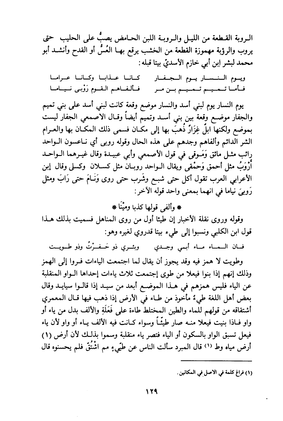 يوم النسار يوم لبني أسد والنسار موضع وقعة كانت لبني أسد على بني تميم والجفار موضع وقعة بين بني أسد وتميم أيضاً وقال الأصمعي الجفار ليست بموضع ولكنها إبلٌ غزارٌ ذهب بها إلى مكان فسمى ذلك المكان بها والعرام الشر الدائم وألفاهم وجدهم على هذه الحال وقوله روبى أي ناعسون الواحد رائب مثل مائق وموقى في قول الأصمعي وأبي عبيدة وقال غيرهما الواحد أروب مثل أحمق وحمقى ويقال الواحد روبان مثل كسلان وكسلى وقال ابن الأعرابي العرب تقول أكل حتى شبع وشرب حتى روى ونام حتى راب ومثل روبى نياما في أنهما بمعنى واحد قوله الآخر: وألفى قولها كذبا وميتا وقوله وروى نقلة الأخبار إن طيئا أول من روى المناهل فسميت بذلك هذا قول ابن الكلبي ونسبوا إلى طيء بيتا قدروي لغيره وهو: