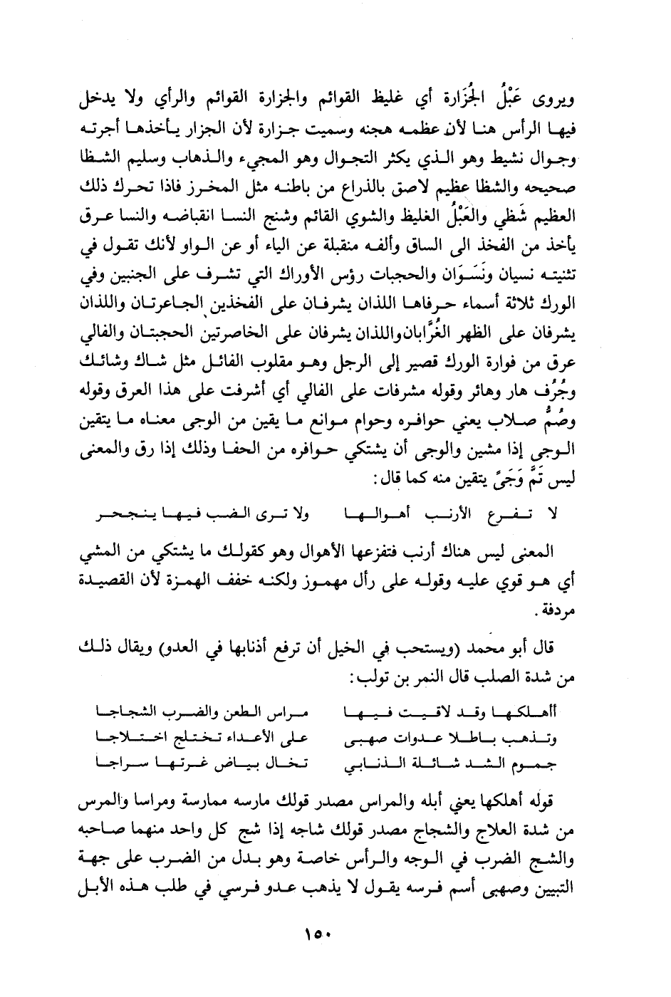 ويروى عبل الجزارة أي غليظ القوائم والجزارة القوائم والرأي ولا يدخل فيها الرأس هنا لأن عظمه هجنه وسميت جزارة لأن الجزار يأخذها أجرته وجوال نشيط وهو الذي يكثر التجوال وهو المجيء والذهاب وسليم الشظا صحيحه والشظا عظيم لاصق بالذراع من باطنه مثل المخرز فإذا تحرك ذلك العظيم شظي والعبل الغليظ والشوي القائم وشنج النسا انقباضه والنسا عرق يأخذ من الفخذ إلى الساق وألفه منقلبة عن الياء أو عن الواو لأنك تقول في تنيته نسيان ونسوان والحجبات رؤوس الأوراك التي تشرف على الجنبين وفي الورك ثلاثة اسماء حرفاها اللذان يشرفان على الفخذين الجاعرتان واللذان يشرفان على الظهر الغرّابان واللذان يشرفان على الخاصرتين الحجبتان والفالي عرق من فوارة الورك قصير إلى الرجل وهو مقلوب الفائل مثل شاك وشائك وجرف هار وهائر وقوله مشرفات على الفالي أي أشرفت على هذا العرق وقوله وصمّ صلاب يعني حوافره وحوام موانع ما يقين من الوجى معناه ما يتقين الوجى إذا مشين والوجى أن يشتكي حوافره من الحفا وذلك إذا رق والمعنى ليس تمّ وجىً يتقين منه كما قال: