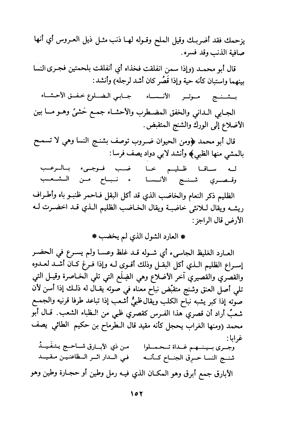 الظليم ذكر النعام والخاضب الذي قد أكل البقل فاحمر ظنبو باه وأطراف ريشه ويقال للأنثى خاضبه ويقال الخاضب الظليم الذي قد أخضرت له الأرض قال الراجز: العارد الشول الذي لم يخضب العارد الغليظ الجاسئ أي شوله قد غلظ وعسا ولم يسرع في الحضر إسراع الظليم الذي أكل البقل وذلك أقوى له وإذا فرغ كان أشد لعدوه والقصيري والقصيري آخر الأضلاع وهي الضلع التي تلي الخاصرة وقيل التي تلي أصل العنق وشنج متقبض نباع معناه في صوته يقال له ذلك إذا أسن لن صوته إذا كبر يشبه نباح الكلب ويقال ظبيّ أشعب إذا تباعد طرفا قرنيه والجمع شعبٌ أراد أن قصري هذا الفرس كقصري ظبي من الظباء الشعب. قال أبو محمد " ومنها الغراب يحجل كأنه مقيد قال الطرماح بن حكيم الطائي يصف غرابا: