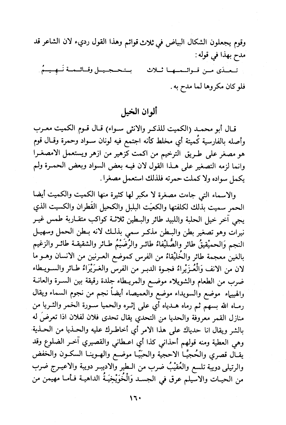 ألوان الخيل قال أبو محمد " الكميت للذكر والأنثى سواء " قال قوم الكميت معرب وأصله بالفارسية كميتة أي مخلط كأنه اجتمع فيه لونان سواد وحمرة وقال قوم هو مصغر على طريق الترخيم من أكمت كزهير من أزهر ويستعمل إلآ مصغرا وإنما لزمه التصغير على هذا القول لأن فيه بعض السواد وبعض الحمرة ولم يكمل سواده ولا كملت حمرته فلذلك استعمل مصغرا.