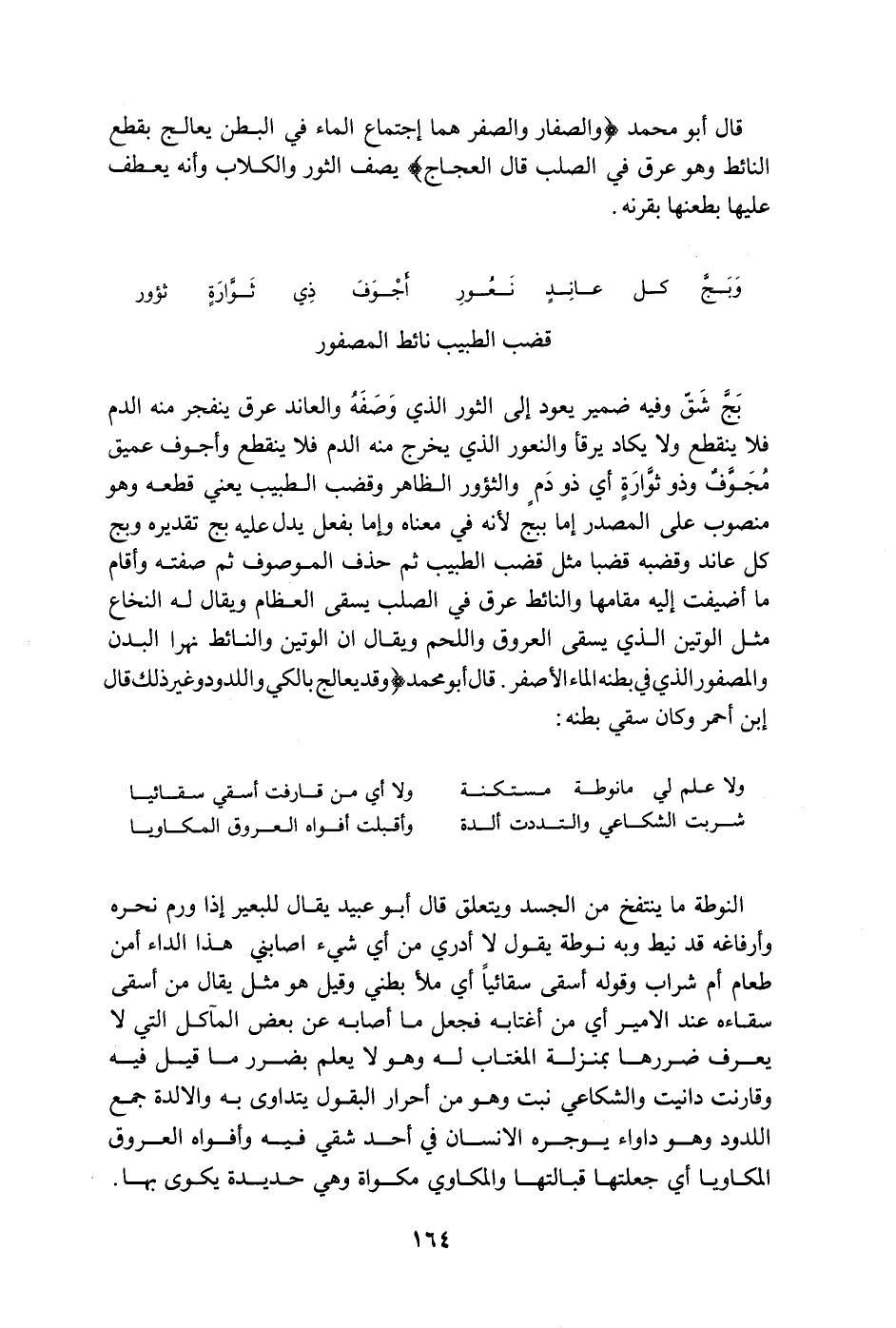 قضب الطبيب نائط المصفور بجّ شقّ وفيه ضمير يعود إلى الثور الذي وصفه والعاند عرق ينفجر منه الدم فلا ينقطع ولا يكاد يرقأ والنعور الذي يخرج منه الدم فلا ينقطع وأجوف عميق مجوّفٌ وذو ثوّارةٍ أي ذو دمٍ والثؤور الظاهر وقضب الطبيب يعني قطعه وهو منصوب على المصدر إما ببج لأنه في معناه وإما بفعل يدل عليه بج تقديره وبج كل عاند وقضبه قضبا مثل قضب الطبيب ثم حذف الموصوف ثم صفته وأقام ما أضيفت إليه مقامها والنائط عرق في الصلب يسقى العظام ويقال له النخاع مثل الوتين الذي يسقى العروق واللحم ويقال أن الوتين والنائط نهرا البدن والمصفور الذي في بطنه الماء الأصفر. وقال أبو محمد " وقد يعالج بالكي واللدود وغير ذلك قال ابن أحمر وكان سقي بطنه: