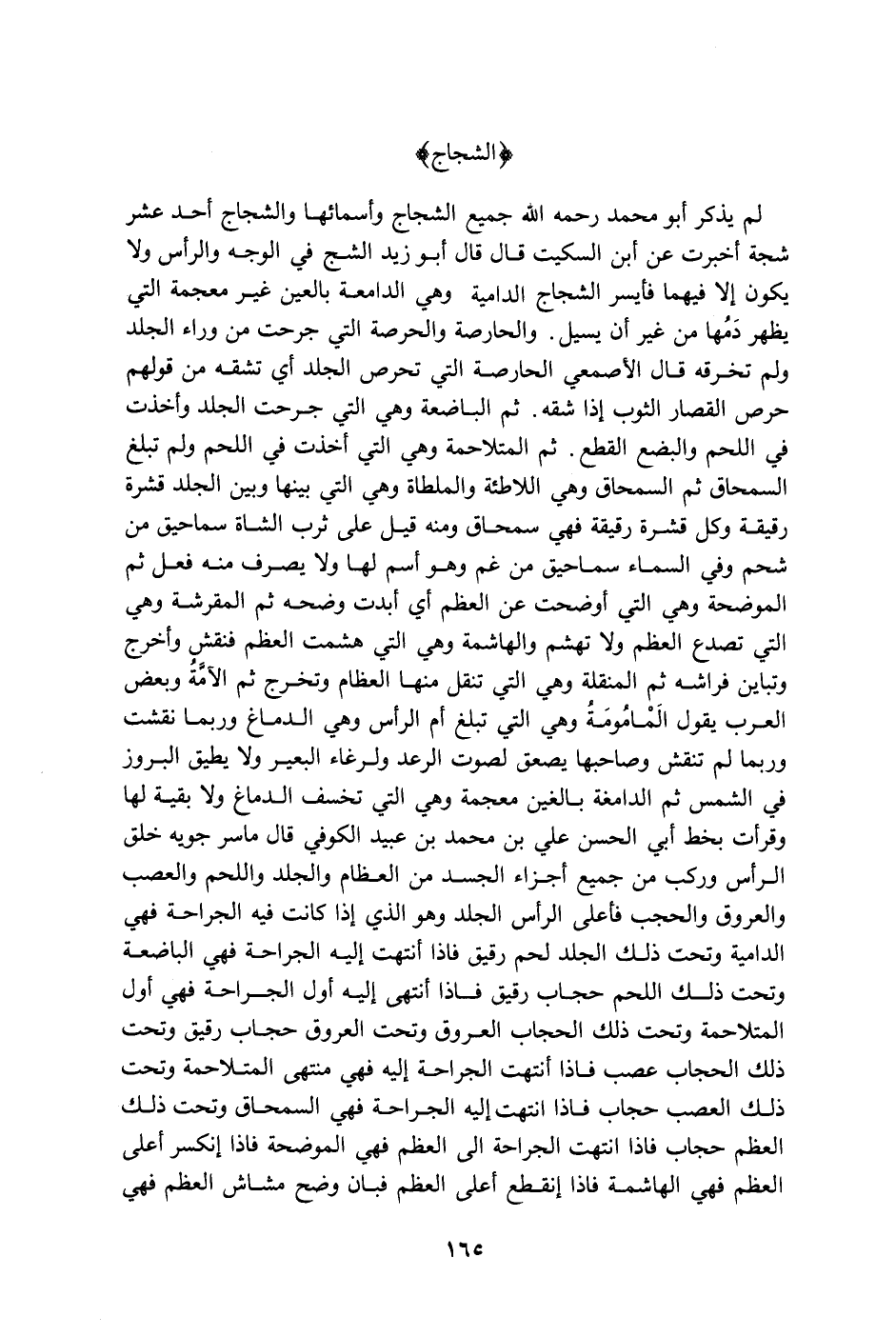 " الشجاج " لم يذكر أبو محمد رحمه الله جميع الشجاج وأسمائها والشجاج أحد عشر شجة أخبرت عن ابن السكيت قال قال أبو زيد الشج في الوجه والرأس ولا يكون إلا فيهما فأيسر الشجاج الدامية وهي الدامعة بالعين غير معجمة التي يظهر دمها من غير أن يسيل. والحارصة والحرصة التي جرحت من وراء الجلد ولم تخرقه قال الأصمعي الحارصة التي تحرص الجلد أي تشقه من قولهم حرص القصار الثوب إذا شقه. ثم الباضعة وهي التي جرحت الجلد وأخذت في اللحم والبضع القطع. ثم المتلاحمة وهي التي أخذت في اللحم ولم تبلغ السمحاق ثم السمحاق وهي اللاطئة والملطاة وهي التي بينها وبين الجلد قشرة رقيقة وكل قشرة رقيقة فهي سمحاق ومنه قيل على ثرب الشاة سماحيق من شحم وفي السماء سماحيق من غم وهو اسم لها ولا يصرف منه فعل ثم الموضحة وهي التي أوضحت عن العظم أي أبدت وضحه ثم المقرشة وهي التي تصدع العظم ولا تهشم والهاشمة وهي التي هشمت العظم فنقش وأخرج وتباين فراشه ثم المنقلة وهي التي تنقل منها العظام وتخرج ثم الآمّة وبعض العرب يقول المامومة وهي التي تبلغ أم الرأس وهي الدماغ وربما نقشت وربما لم تنقش وصاحبها يصعقلصوت الرعد ولرغاء البعير ولا يطيق البروز في الشمس ثم الدامغة بالغين معجمة وهي التي تخسف الدماغ ولا بقية لها وقرأت بخط أبي الحسن علي بن محمد بن عبيد الكوفي قال ماسر جويه خلق الرأس وركب من جميع أجزاء الجسد من العظام والجلد واللحم والعصب والعروق والحجب فأعلى الرأس الجلد وهو الذي إذا كانت فيه الجراحة فهي الدامية وتحت ذلك الجلد لحم رقيق فإذا انتهت إليه الجراحة فهي الباضعة وتحت ذلك اللحم حجاب رقيق فإذا