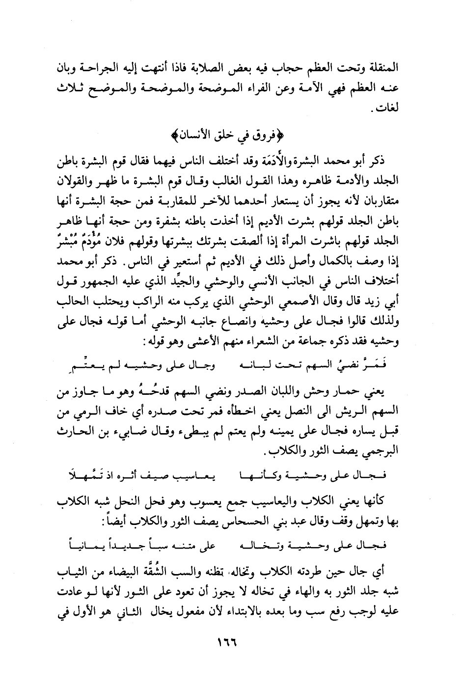 " فروق في خلق الانسان " ذكر أبو محمد البشرة والأدمة وقد اختلف الناس فيهما فقال قوم البشرة باطن الجلد والأدمة ظاهره وهذا القول الغالب وقال قوم البشرة ما ظهر والقةلان متقاربان لأنه يجوز أن يستعار أحدهما للآخر للمقاربة فمن حجة البشرة أنها باطن الجلد قولهم بشرت الأديم إذا أخذت باطنه بشفرة ومن حجة أنها ظاهر الجلد قولهم باشرت المرأة إذا ألصقت بشرتك ببشرتها وقولهم فلان مؤدم مبشر إذا وصف بالكمال وأصل ذلك في الأديم ثم أستعير في الناس. ذكر أبو محمد اختلاف الناس في الجانب الأنسي والوحشي والجيد الذي عليه الجمهور قول أبي زيد قال وقال الأصمعي الوحشي الذي يركب منه الراكب ويحتلب الحالب ولذلك قالوا فجال على وحشيه وانصاع جانبه الوحشي أما قوله فجال على وحشيه فقد ذكره جماعة من الشعراء منهم الأعشى وهو قوله: