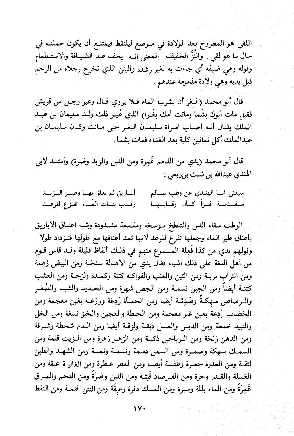 الوطب سقاء اللبن والتلطخ بوسخه ومفدمه مشدودة وشبه أعناق الأباريق بأعناق طير الماء وجعلها تفرغ للرعد لأنها تمد أعناقها مع طولها فتزداد طولا. وقولهم يدي من كذا فعلة المسموع منهم في ذلك ألفاظ قليلة وقد قاس قوم من أهل اللغة على ذلك أشياء فقال يدي من الإهالة سنخة ومن البيض زهمة ومن التراب تربة ومن التين والعنب والفواكه كتنة وكمدة ولزجة ومن العشب كتنة أيضاً ومن الجبن نسمة ومن الجص شهرة ومن الحديد والشبه والصفر والرصاص سهكةٌ وصدئة أيضا ومن الحمأة ردغة ورزغة بغين معجمة ومن الخضاب ردعة بعين غير معجمة ومن الحنطة والعجين والخبز نسغة ومن الخل والنبيذ خمطة ومن الدبس والعسل دبقة ولزقة أيضا ومن الدم شحطة وشرقة ومن الدهن زنخة ومن الرياحين ذكية ومن الزهر زهرة ومن الزيت قنمة ومن السمك سهكة وصمرة ومن السمن دسمة ونسمة ونمسة ومن الشهد والطين لثقة ومن العذرة جعرة وطفسة أيضا ومن العطر عطرة ومن الغالية عبقة ومن الغسلة والقدر وحرة ومن الفرصاد قنئة ومن اللبن وضرةٌ ومن اللحم والمرق غمرةٌ ومن الماء بللة وسبرة ومن المسك ذفرة وعبقة ومن النتن قنمة ومن النفط