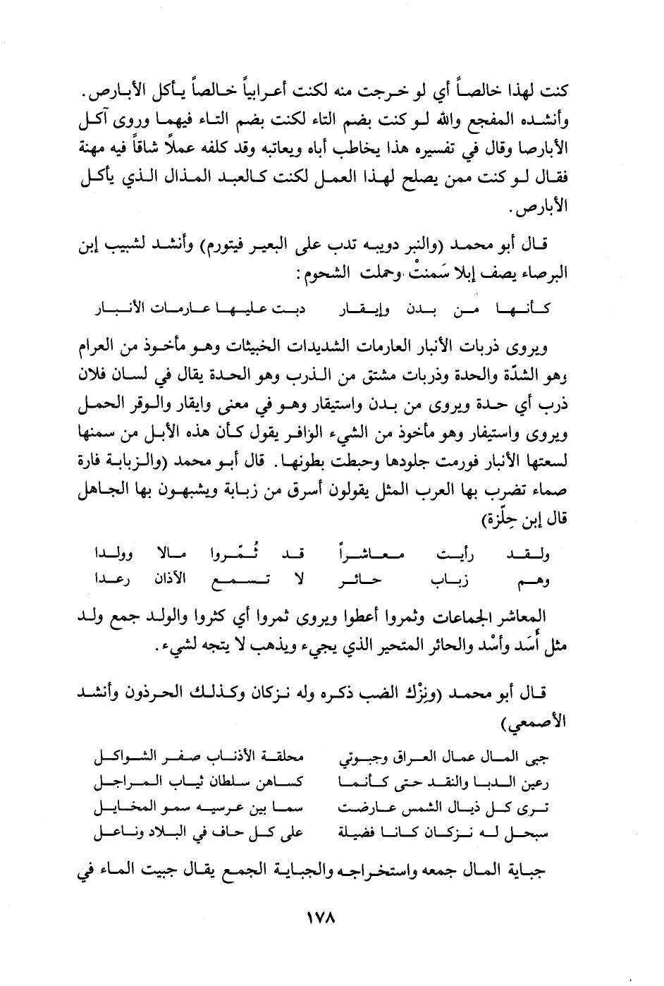 ويروى ذربات العارمات الشديدات الخبيثات وهو مأخوذ من العرام وهو الشدّة والحدة وذربات مشتق من الذرب وهو الحدة يقال في لسان فلان ذرب أي حدة ويروى من بدن واستيقار وهو في معنى وإيقار والوقر الحمل ويروى واستيفار وهو مأخوذ من الشيء الوافر يقول كأن هذه الإبل من سمنها لسعتها الأنبار فورمت جلودها وحبطت بطونها. قال أبو محمد " والزبابة فارة صماء تضرب بها العرب المثل يقولون أسرق من زبابة ويشبهون بها الجاهل قال ابن حلّزة "