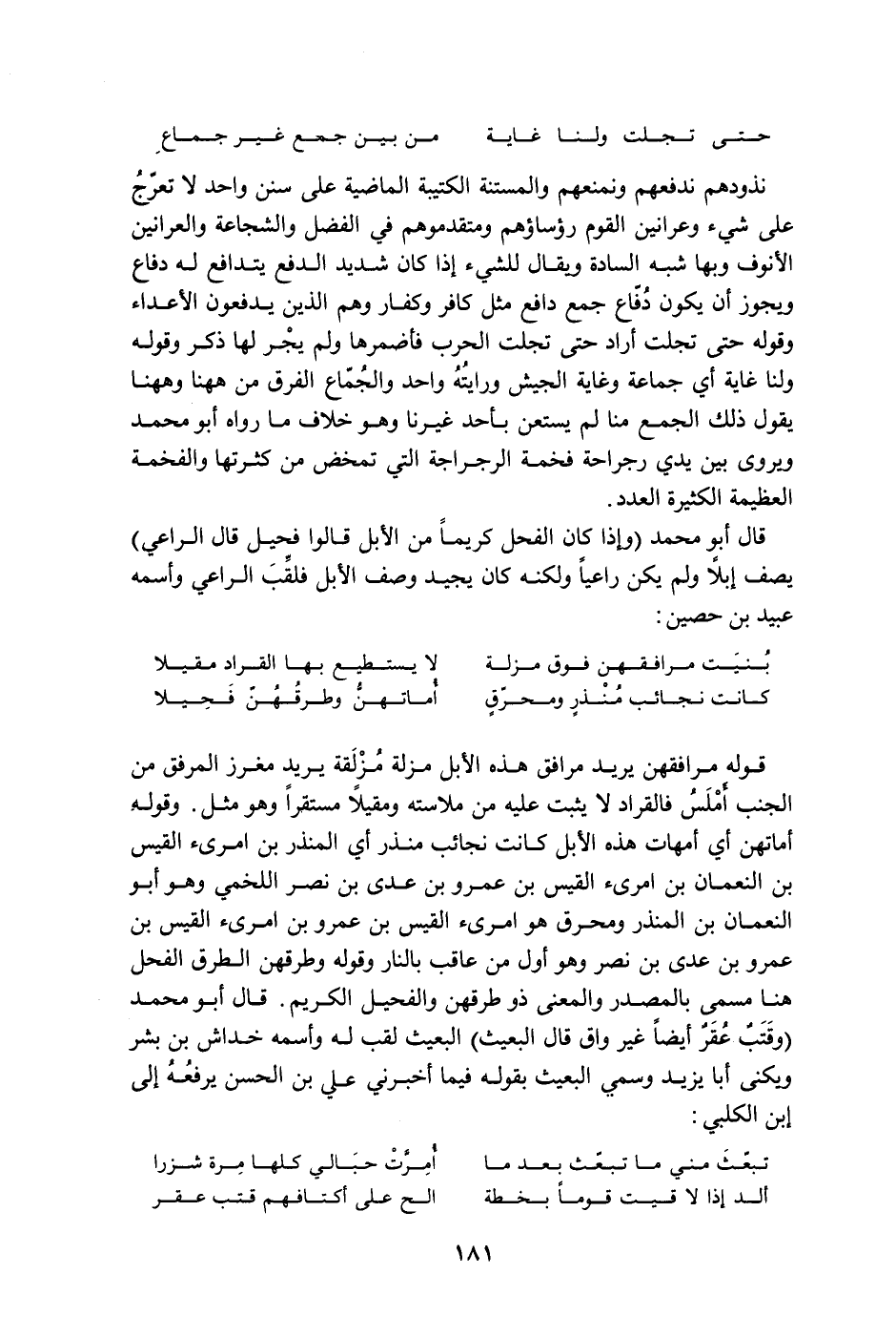 قوله مرافقهن يريد مرافق هذه الإبل مزلة مزلقة يريد مغرز المرفق من الجنب أملس فالقراد لا يثبت عليه من ملاسته ومقيلاً مستقراً وهو مثل. وقوله أماتهن أي أمهات هذه الإبل كانت نجائب منذر أي المنذر بم امرئ القيس بن النعمان بن امرئ القيس بن عمرو بن عدي بن نصر اللخمي وهو أبو النعمان بن المنذر ومحرق هو امرئ القيس بن عمرو بن امرئ القيس بن عمرو بن عدي بن نصر وهو أول من عاقب بالنار وقوله وطرقهن الطرق الفحل هنا مسمى بالمصدر والمعنى ذو طرقهن والفحيل الكريم. قال أبو محمد " وقتبٌ عقرٌ أيضاً غير واق قال البعيث " البعيث لقب له واسمه خداش بن بشر ويكنى أبا يزيد وسمي البعيث بقوله فيما أخبرني علي بن الحسن يرفعه إلى ابن الكلبي: