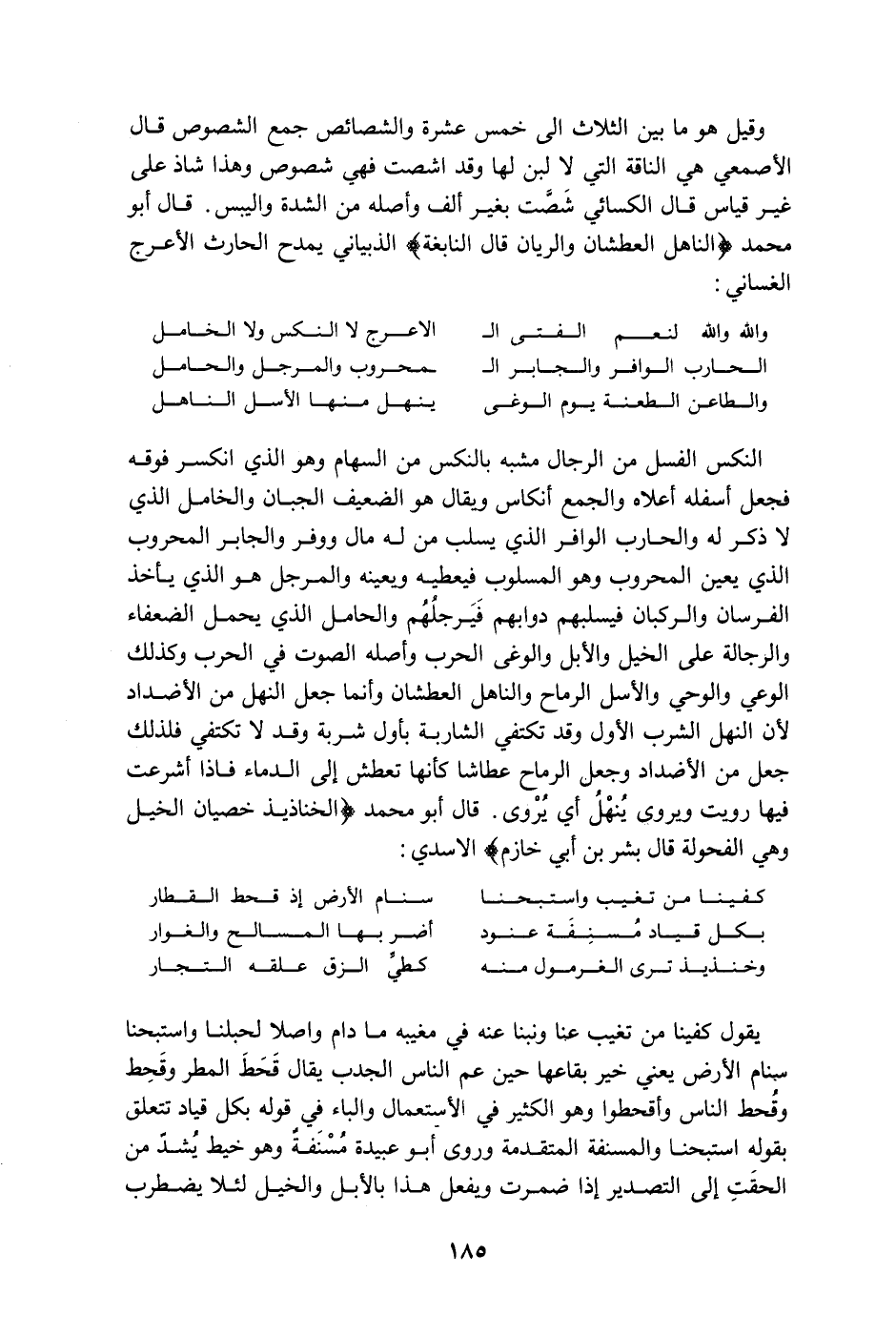النكس الفسل من الرجال مشبه بالنكس من السهام وهو الذي انكسر فوقه فجعل أسفله أعلاه والجمع أنكاس ويقال هو الضعيف الجبان والخامل الذي لا ذكر له والحارب الوافر الذي يسلب من له مال ووفر والجابر المحروب الذي يعين المحروب وهو المسلوب فيعطيه ويعينه والمرجل هو الذي يأخذ الفرسان والركبان فيسلبهم دوابهم فيرجلهم والحامل الذي يحمل الضعفاء والرجالة على الخيل والإبل والوغى الحرب وأصله الصوت في الحرب وكذلك الوعي والوحي والأسل الرماح والناهل العطشان وإنما جعل النهل من الأضداد لأن النهل الشرب الأول وقد تكتفي الشاربة بأول شربة وقد لا تكتفي فلذلك جعل من الأضداد وجعل الرماح عطاشا كأنها تعطش إلى الدماء فإذا أشرعت فيها رويت ويروى ينهل أي يروى. قال أبو محمد " الخناذيذ خصيان الخيل وهي الفحولة قال بشر بن أبي خازم " الأسدي: