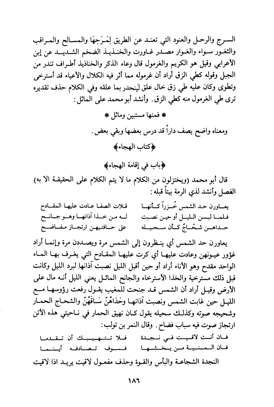 السرج والرحل والعنود التي تعند عن الطريق لمرحها والمسالح والمراقب والثغور سواء والغوار مصدر غاورت والخنذيذ الضخم الشديد عن ابن الأعرابي وقيل هو الكريم والغرمول قال وعاء الذكر والخناذيذ أطراف تنذر من الجبل وقوله كطي الزق أراد أن غرموله مما أثر فيه الكلال والأعياء قد استرخى وتطوى وكان عليه طي زق خال علق لينحدر بما علقه وفي الكلام حذف تقديره ترى طي الغرمول منه كطي الزق. وأنشد أبو محمد على المائل: فمنها مستبين وماثل ومعناه واضح يصف داراً قد درس بعضها وبقي بعض.