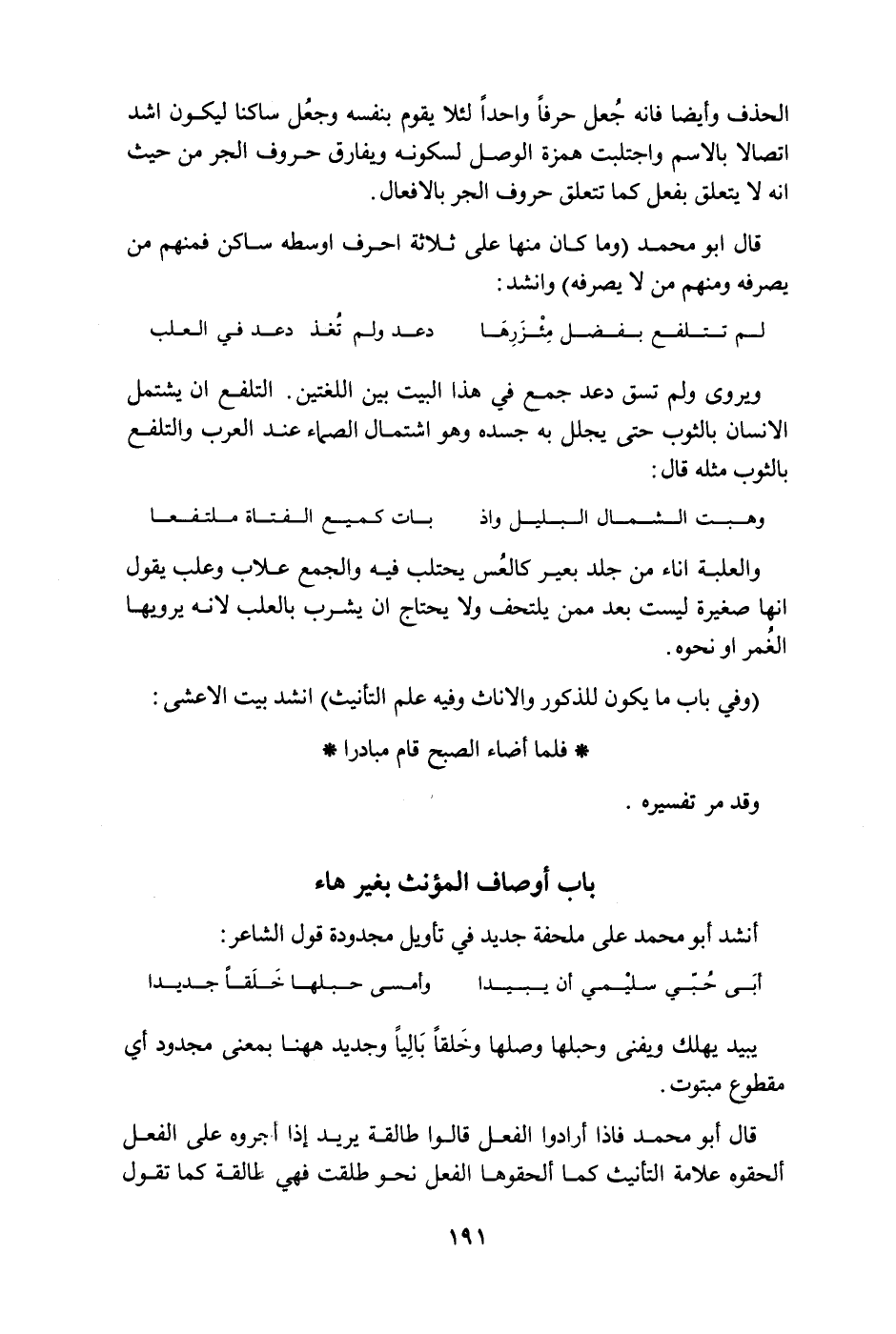 " وفي باب ما يكون للذكور والإناث وفيه علم التأنيث " أنشد بيت الأعشى: فلما أضاء الصبح قام مبادرا وقد مر تفسيره.