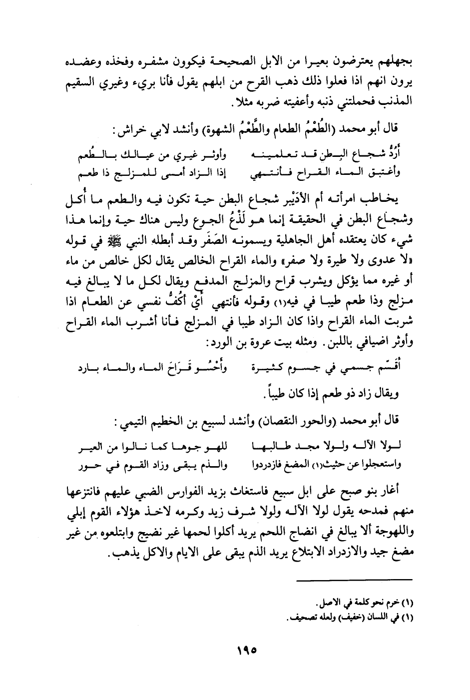 قال أبو محمد " الطعم الطعام والطعم الشهوه " وأنشد لأبي خراش: