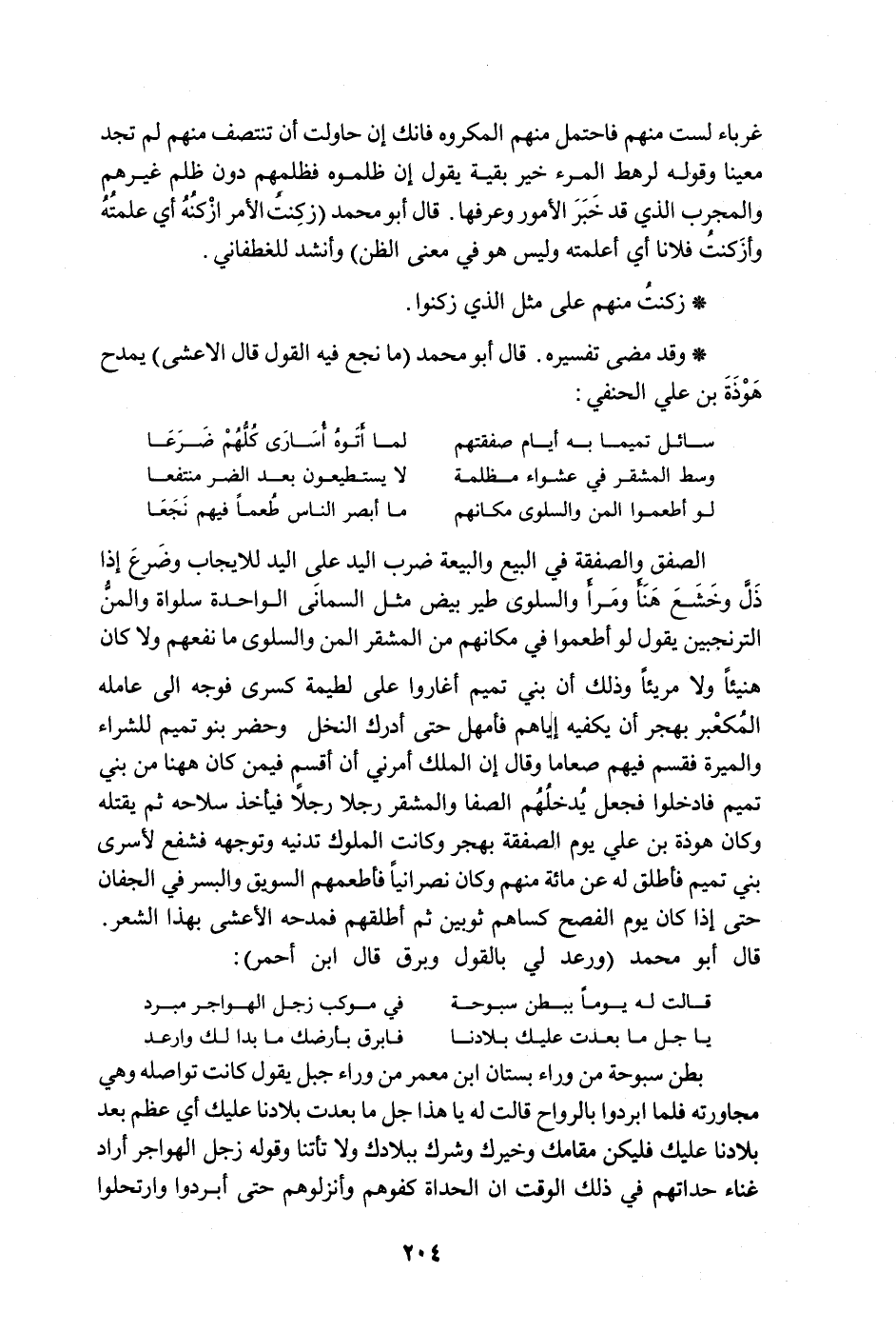 الصفق والصفقة في البيع والبيعة ضرب اليد على اليد للأيجاب وضرع إذا ذلّ وخشع هنأ ومرأ والسلوى طير بيض مثل السمانى الواحدة سلواة والمنّ الترنجبين يقول لو أطعموا في مكانهم من المشقر المن والسلوى ما نفعهم ولا كان هبيئاً ولا مريئاً وذلك أن بني تميم أغاروا على لطيمة كسرى فوجه إلى عامله المكعبر بهجر أن يكفيه إياهم فأمهل حتى أدرك النخل وحضر بنو تميم للشراء والميرة فقسم فيهم صعاما وقال إن الملك أمرني أنأقسم فيمن كان ههنا من بني تميم فأدخلوا فجعل يدخلهم الصفا والمشقر رجلا رجلاً فيأخذ سلاحه ثم يقتله وكان هوذة بن علي يوم الصفقة بهجر وكانت الملوك تدنيه وتوجهه فشفع لسرى بني تميم فأطلق له عن مائة منهم وكان نصرانياً فأطعمهم السوبق والبسر في الجفان حتى إذا كان يوم الفصح كساهم ثوبين ثم أطلقهم فمدحه الأعشى بهذا الشعر. قال أبو محمد " ورعد لي بالقول وبرق قال ابن أحمر ":