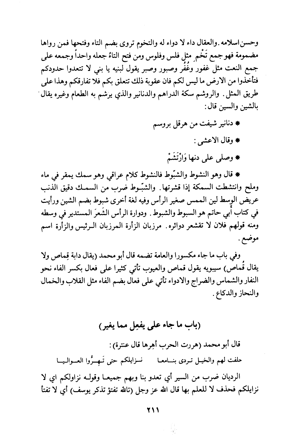 وحسن إسلامه والعقال داء لا دواء له والنجوم تروى بضم التاء وفتحها فمن رواها مضمومة فهو جمع تخم مثل فلس وفلوس ومن فتح التاء جعله واحداً وجمعه على جمع النعت مثل غفور وغفر وصبور وصبر يقول لبنيه يا بني لا تتعدوا حدودكم فتأخذوا من الأرض ما ليس لكم فإن عقوبة ذلك تتعلق بكم فلا تفارقكم وهذا على طريق المثل. والروشم سكة الدراهم والدنانير والذي يرشم به الطعام وغيره يقال بالشين والسين قال: دنانير شيفت من هرقل بروسم وقال الأعشى: وصلى على دنها وارتشم قال وهو النشوط والشبوط فالنشوط كلام عراقي وهو سمك يمقر في ماء وملح وانتشطت السمكة إذا قشرتها. والشبّوط ضرب من السمك دقيق الذنب عريض الوسط لين الممس صغير الرأس وفيه لغة أخرى شبوط بضم الشين ورأيت في كتاب أبي حاتم هو السبوط والشبوط. ودوارة الرأس الشعر المستدير في وسطه ومنه قولهم فلان لا تقشعر دوائره. مزربان الزأرة المزربان الرئيس والزأرة اسم موضع.
