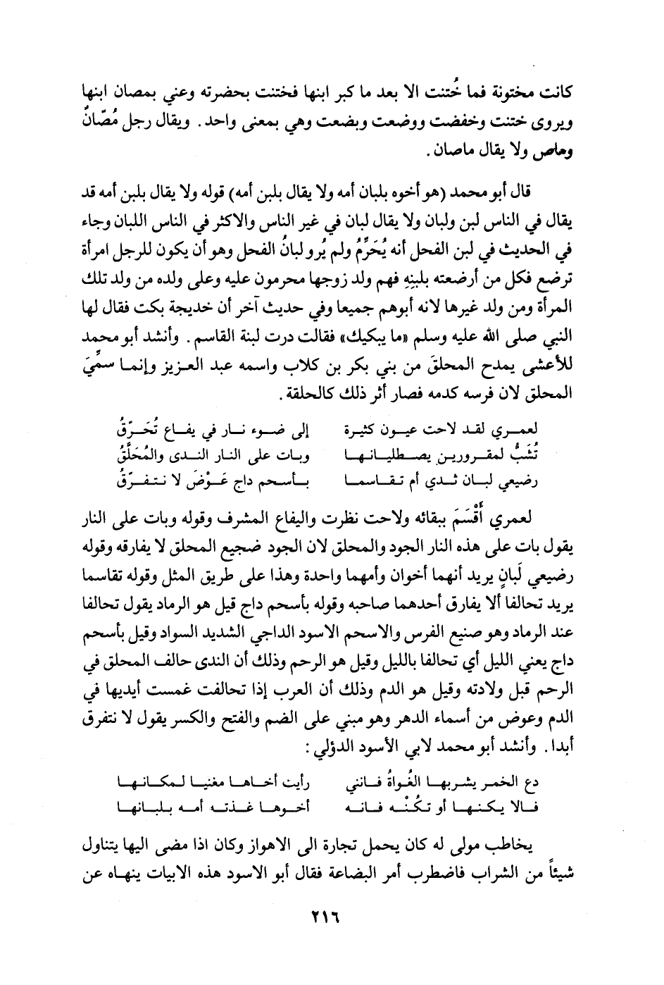 قال أبو محمج " هو أخوه بلبان أمه ولا يقال بلبن أمه " قوله ولا يقال بلبن أمه قد يقال في الناس لبن ولبان ولا يقال لبان في غير الناس والأكثر في الناس اللبان وجاء في الحديث في لبن الفحل أنه يحرّم ولم يرو لبان الفحل وهو أن يكون للرجل امرأة ترضع فكل من أرضعته بلبنه فهم ولد زوجها محرمون عليه وعلى ولده من ولد تلك المرأة ومن ولد غيرها لأنه ابوهم جميعا وفي حديث آخر أن خديجة بكت فقال لها النبي صلى الله عليه وسلم " ما يبكيك " فقالت درت لبنة القاسم. وأنشد أبو محمد للأعشى يمدح المحلق من بني بكر بن كلاب واسمه عبد العزيز وإنما سمّي المحلق لأن فرسه كدمه فصار اثر ذلك كالحلقة.