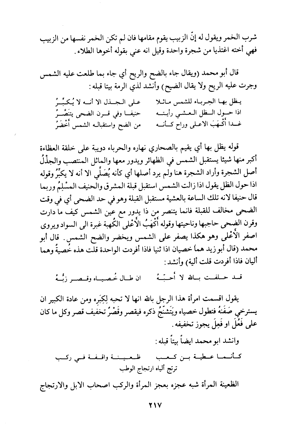 قوله يظل بها أي يقيم بالصحاري نهاره والحرباء دويبة على خلقة العظاءة أكبر منها شيئا يستقبل الشمس في الظهائر ويدور معها والماثل المنتصب والجذل أصل الشجرة وأراد الشجرة هنا ولم يرد أصلها أي كأنه يصلّي إلا أنه لا يكبر وقوله إذا حول الظل يقول إذا زالت الشمس استقبل قبلة المشرق والحنيف المسلم وربما قال حنيفا لأنه تلك الساعة بالعشية مستقبل القبلة وهو في حد الضحى أي في وقت الضحى مخالف للقبلة فإنما ينتصر من ذا يدور مع عين الشمس كيف ما دارت وقرن الضحى حاجبها وناحيتها وقوله أكهب الأعلى الكهبة غبرة إلى السواد ويروى أصفر الأعلى وهو هكذا يصفر على الشمس ويخضر والضح الشمس قال أبو محمد " قال أبو زيد هما خصيان إذا ثنيا فإذا أفردت الواحدة قلت هذه خصية وهما أليان فإذا أفردت قلت ألية " وأنشد:
