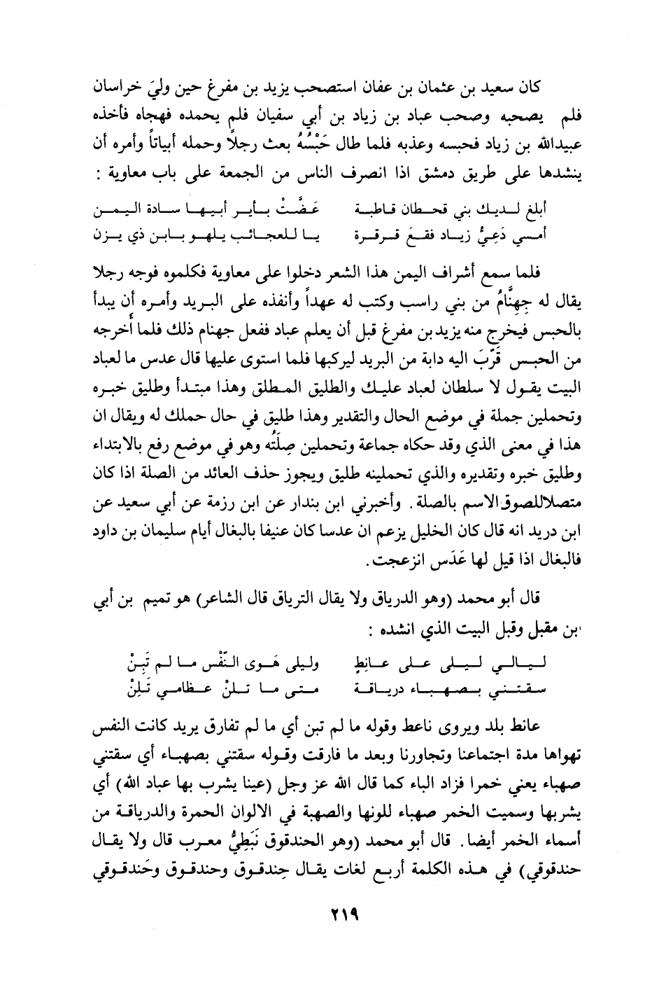 عانط بلد ويروى ناعط وقوله ما لم تبن أي ما لم تفارق يريد كانت النفس تهواها مدة اجتماعنا وتجاورنا وبعد ما فارقت وقوله سقتني بصهباء أي سقتني صهباء يعني خمرا فزاد الباء كما قال الله عز وجل: عينا يشرب بها عباد الله " أي يشربها وسميت الخمر صهباء للونها والصهبة في الألوان الحمرة والدرياقة من أسماء الخمر ايضا. قال أبو محمد " وهو الحندقوق نبطيّ معرب قال ولا يقال حندوقي " في هذه الكلمة أربع لغات يقال حندقوق وحندقوق وحندقوقي وحندقوقي