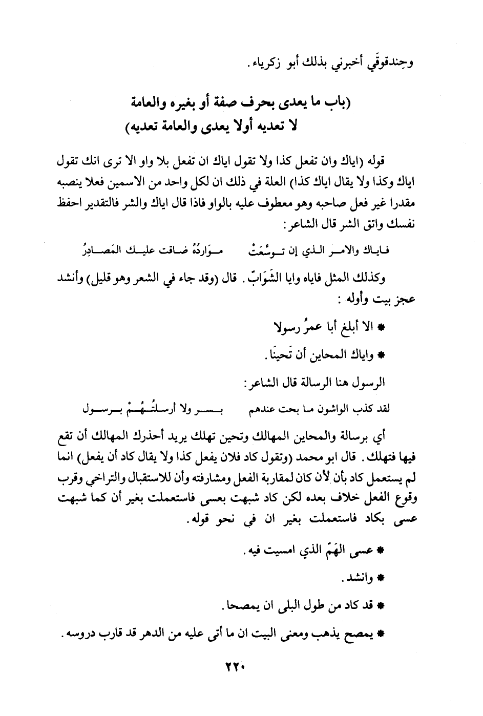 لا تعديه أولا يعدى والعامة تعديه " قوله " إياك وإن تفعل كذا ولا تقول إياك أم تفعل بلا واو ألا ترى إنك تقول إياك وكذا ولا يقال غياك كذا " العلة في ذلك أن لكل واحد من الاسمين فعلا ينصبه مقدرا غير فعل صاحبه وهو معطوف عليه بالواو فإذا قال إياك والشر فالتقدير احفظ نفسك واتق الشر قال الشاعر: