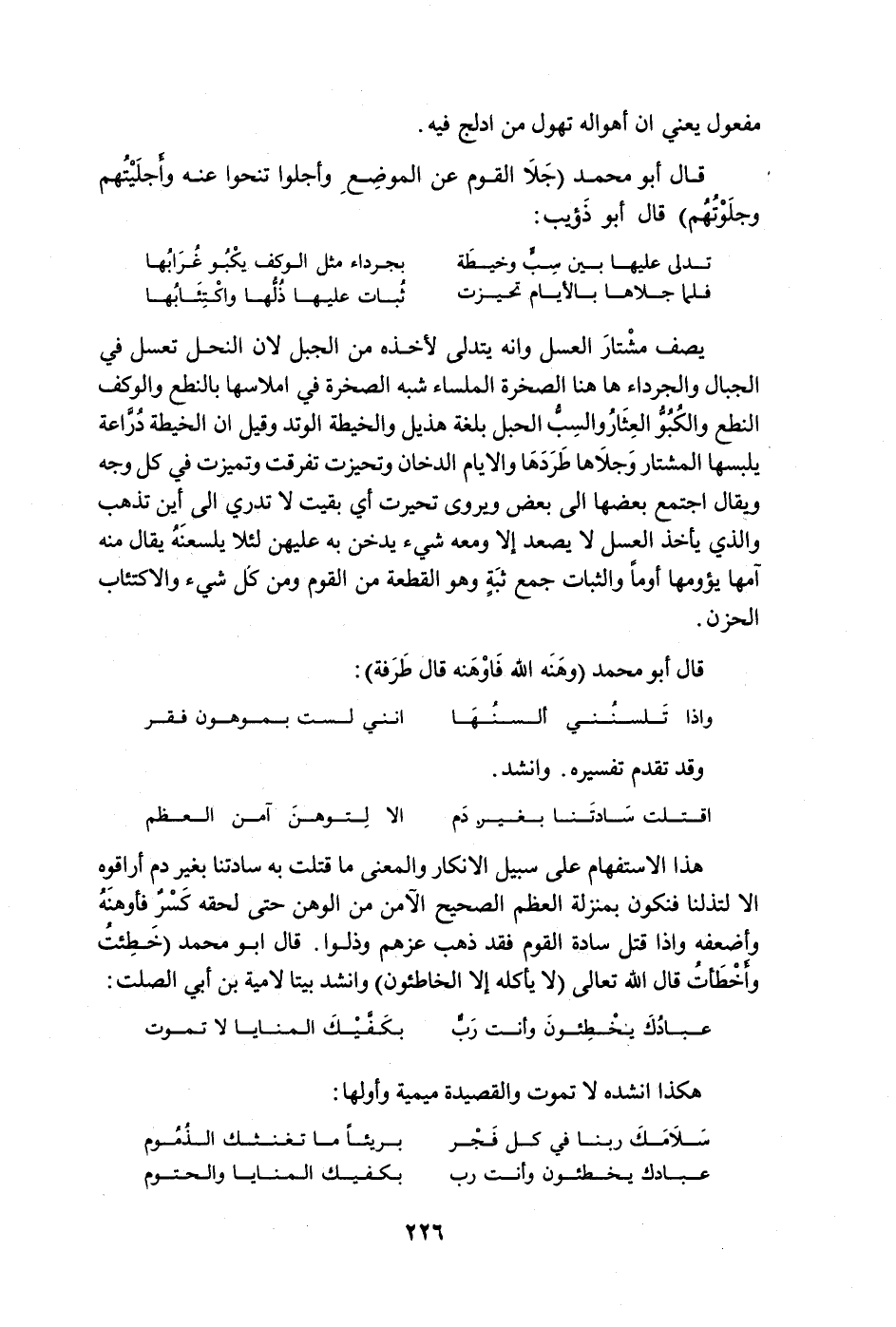 يصف مشتار العسل وإنه يتدلى لأخذه من الجبل لأن النحل تعسل في الجبال والجرداء ها هنا الصخرة الملساء شبه الصخرة في أملاسها بالنطع والوكف النطع والكبوّ العثار والسبّ الحبل بلغة هذيل والخيطة الوتد وقيل أن الخيطة درّاعة يلبسها المشتار وجلاها طردها والأيام الدخان وتحيزت تفرقت وتميزت في كل وجه ويقال اجتمع بعضها إلى بعض ويروى تحيرت أي بقيت لا تدري إلى أين تذهب والذي يأخذ العسل لا يصعد إلا ومعه شيء يدخن به عليهن لئلا يلسعنه يقال منه آمها يؤومها أوماً والثبات جمع ثبةٍ وهو القطعة من القوم ومن كل شيء والاكتئاب الحزن.