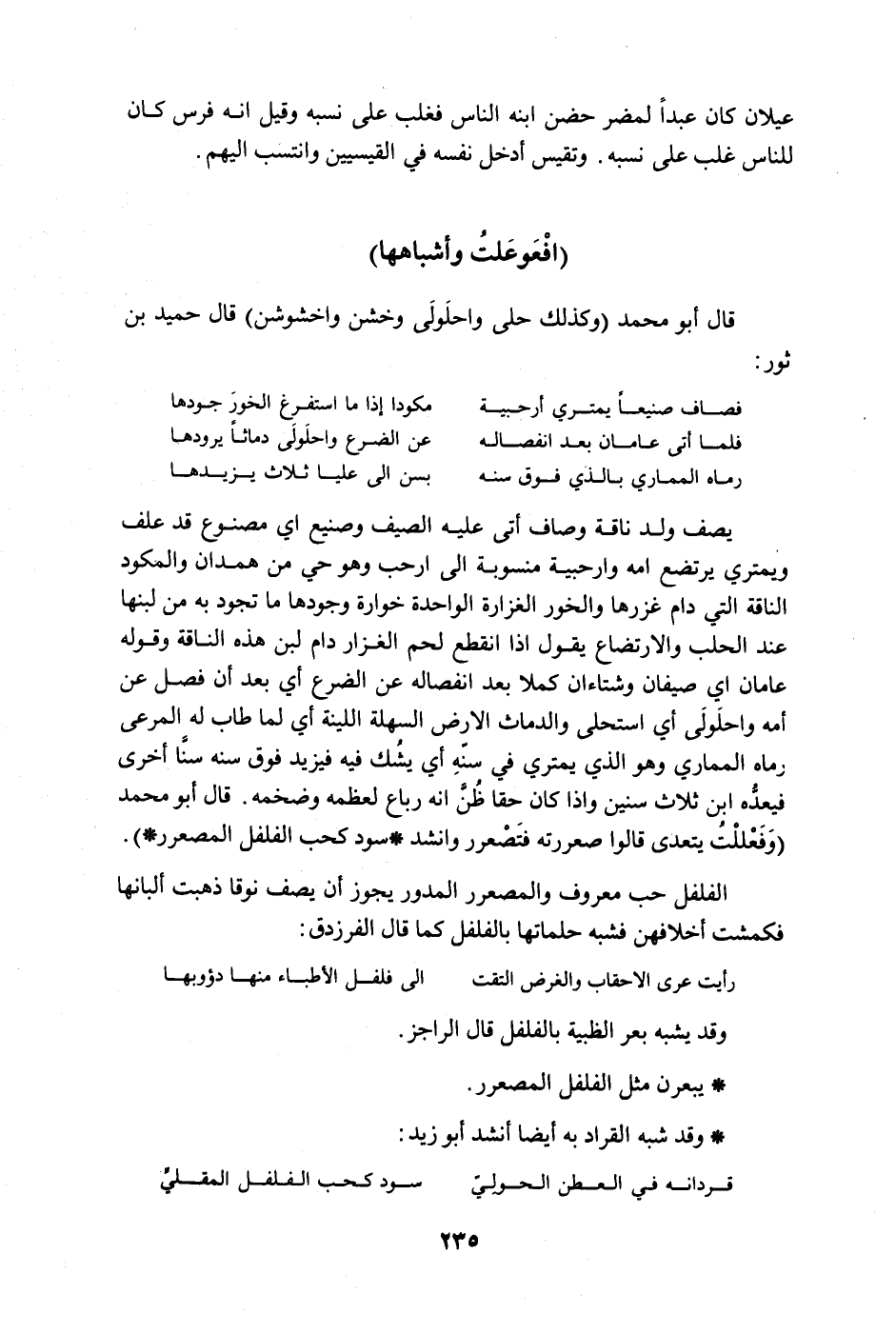 يصف ولد ناقة وصاف أتى عليه الصيف وصنيع أي مصنوع قد علف ويمتري يرتضع أمه وأرحبية منسوبة إلى أرحب وهو حي من همدان والمكود الناقة التي دام غزرها والخور الغزارة الواحدة خوارة وجودها ما تجود به من لبنها عند الحلب والارتضاع يقول إذا انقطع لحم الغزار دام لبن هذه الناقة وقوله عامان أي صيفان وشتاءان كملا بعد انفصاله عن الضرع أي بعد أن فصل عن أمه احلولى أي استحلى والدماث الأرض السهلة اللينة أي لما طاب له المرعى رماه المماري وهو الذي يمتري في سنّه أي يشك فيه فيزيد فوق سنه سناً أخرى فيعدّه ابن ثلاث سنين وإذا كان حقا ظنّ أنه رباع لعظمه وضخمه. قال أبو محمد " وفعللت يتعدى قالوا صعررته فتصعرر وأنشد سود كحب الفلفل المصعرر ". الفلفل حب معروف والمصعرر المدور يجوز أن يصف نوقا ذهبت ألبانها فكمشت أخلافهن فشبه حلماتها بالفلفل كما قال الفرزدق: