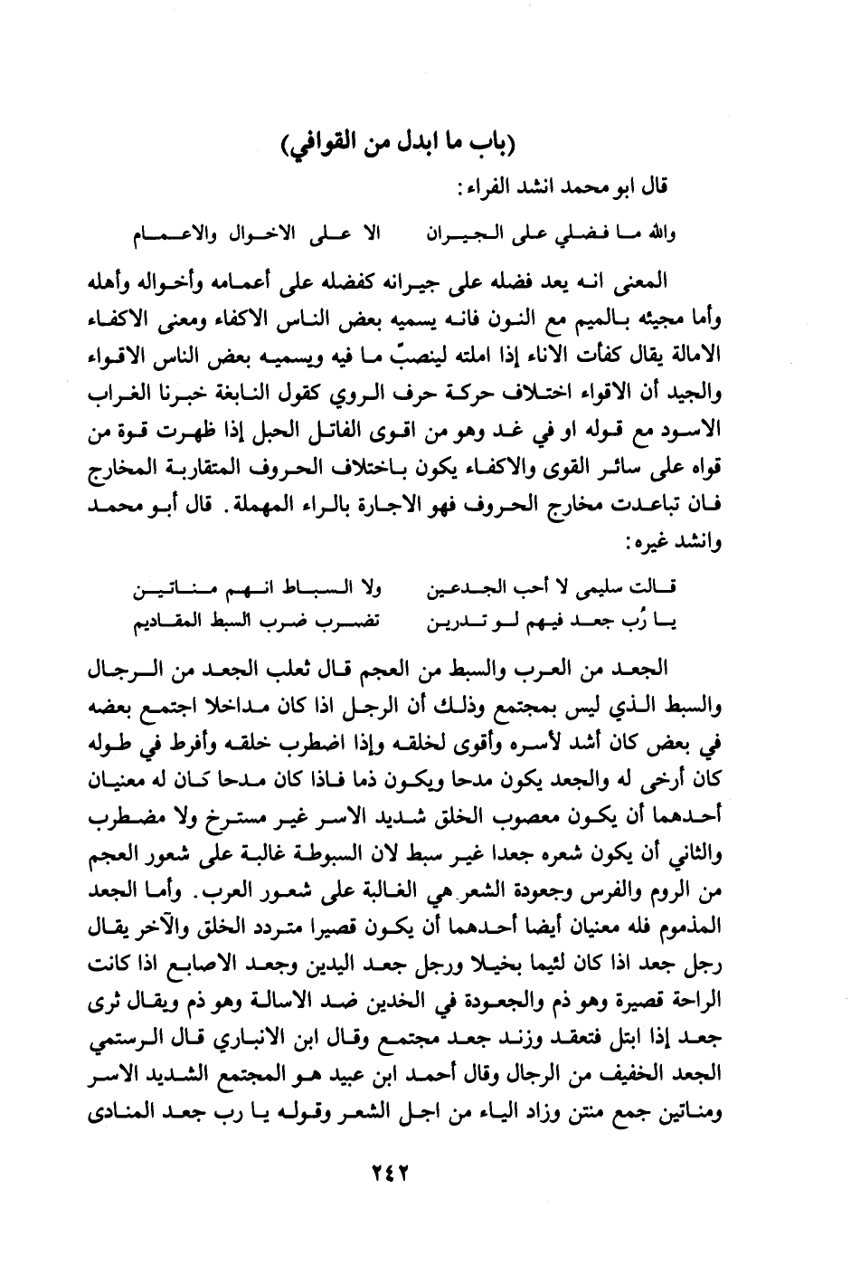 المعنى أنه يعد فضله على جيرانه كفضله على أعمامه وأخواله وأهله وأما مجيئه بالميم مع النون فإنه يسميه بعض الناس الأكفاء ومعنى الأكفاء الإمالة يقال كفأت الإناء إذا أملته لينصبّ ما فيه ويسميه بعض الناس الاقواء والجيد أن الأقواء اختلاف حركة حرف الروي كقول النابغة خبرنا الغراب الأسود مع قوله أو في غد وهو من أقوى الفاتل الحبل إذا ظهرت قوة من قواه على سائر القوى والأكفاء يكون باختلاف الحروف المتقاربة المخارج فإن تباعدت مخارج الحروف فهو الإجارة بالراء المهملة. قال أبو محمد وأنشد غيره: