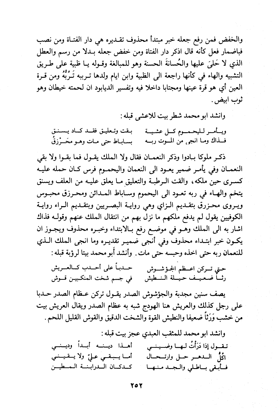 ذكر ملوكا بادوا وذكر النعمان فقال ولا الملك يقول فما بقوا ولا بقي النعمان وفي يأمر ضمير يعود إلى النعمان واليحموم فرس كان حمله عليه كسرى حين ملكه، وألقت الرطبة والتعليق ما يعلق عليه من العلف ويسنق يتخم والهاء في ربه تعود إلى اليحموم وساباط المدائن ومحرزق محبوس ويروى محزرق بتقديم الزاي وهي رواية البصريين وبتقديم الراء رواية الكوفيين يقول لم يدفع ملكهم ما نزل بهم من انتقال الملك عنهم وقوله فذاك أشار به إلى الملك وهو في موضع رفع بالابتداء وخبره محذوف ويجوز أن يكون خبر ابتداء محذوف وفي أنجى ضمير تقديره وما أنجى الملك الذي للنعمان ربه حتى أخذه وحبسه حتى مات. وأنشد أبو محمد بيتا لرؤبة قبله: