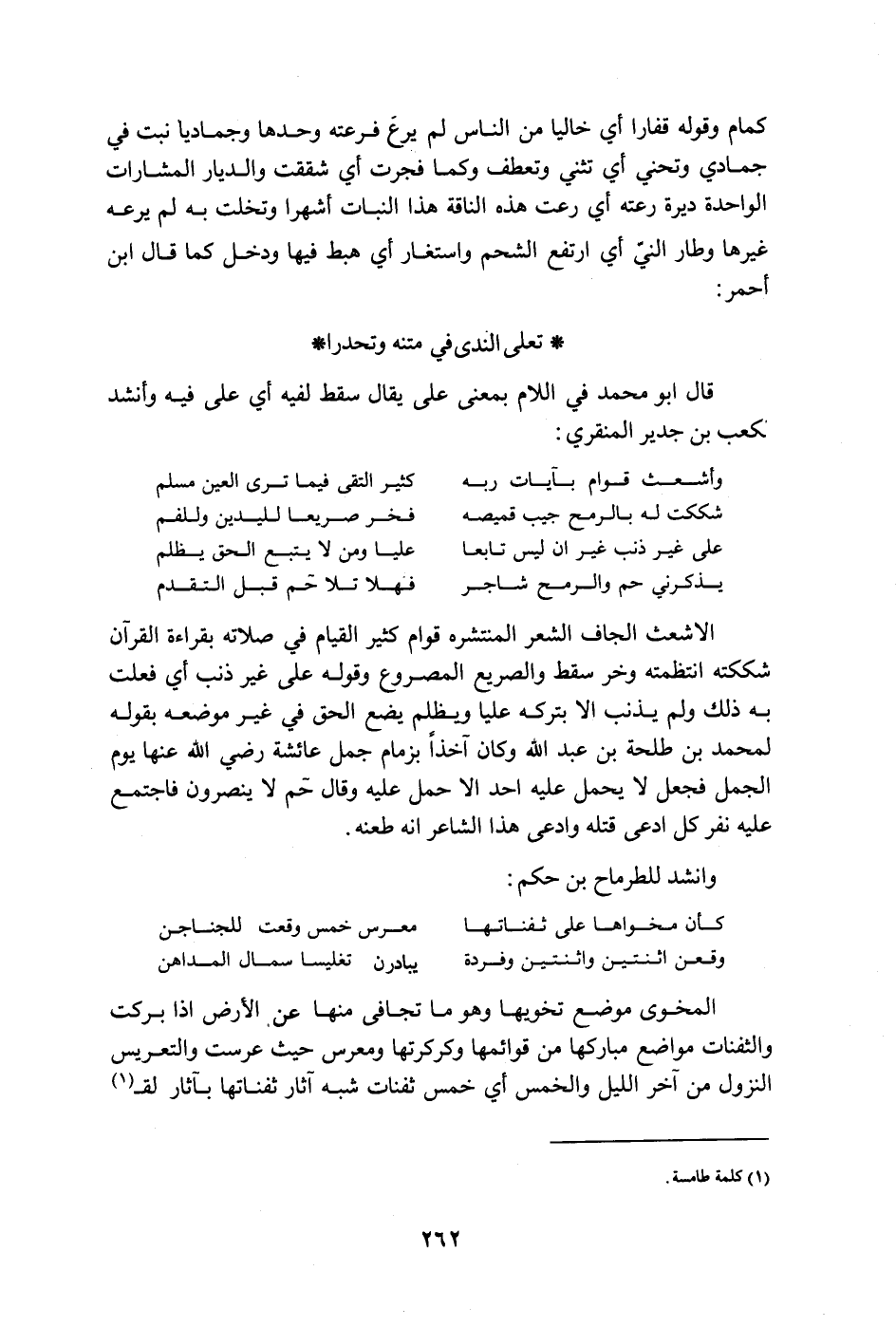 كمام وقوله قفارا أي خالياً من الناس لم يرع فرعته وحدها وجماديا نبت في جمادي أي تثني وتعطف وكما فجرت أي شققت والديار المشارات الواحدة ديرة رعته أي رعت هذه الناقة هذا النبات أشهرا وتخلت به لم يرعه غيرها وطار النيّ أي ارتفع الشحم واستغار أي هبط فيها ودخل كما قال ابن أحمر: