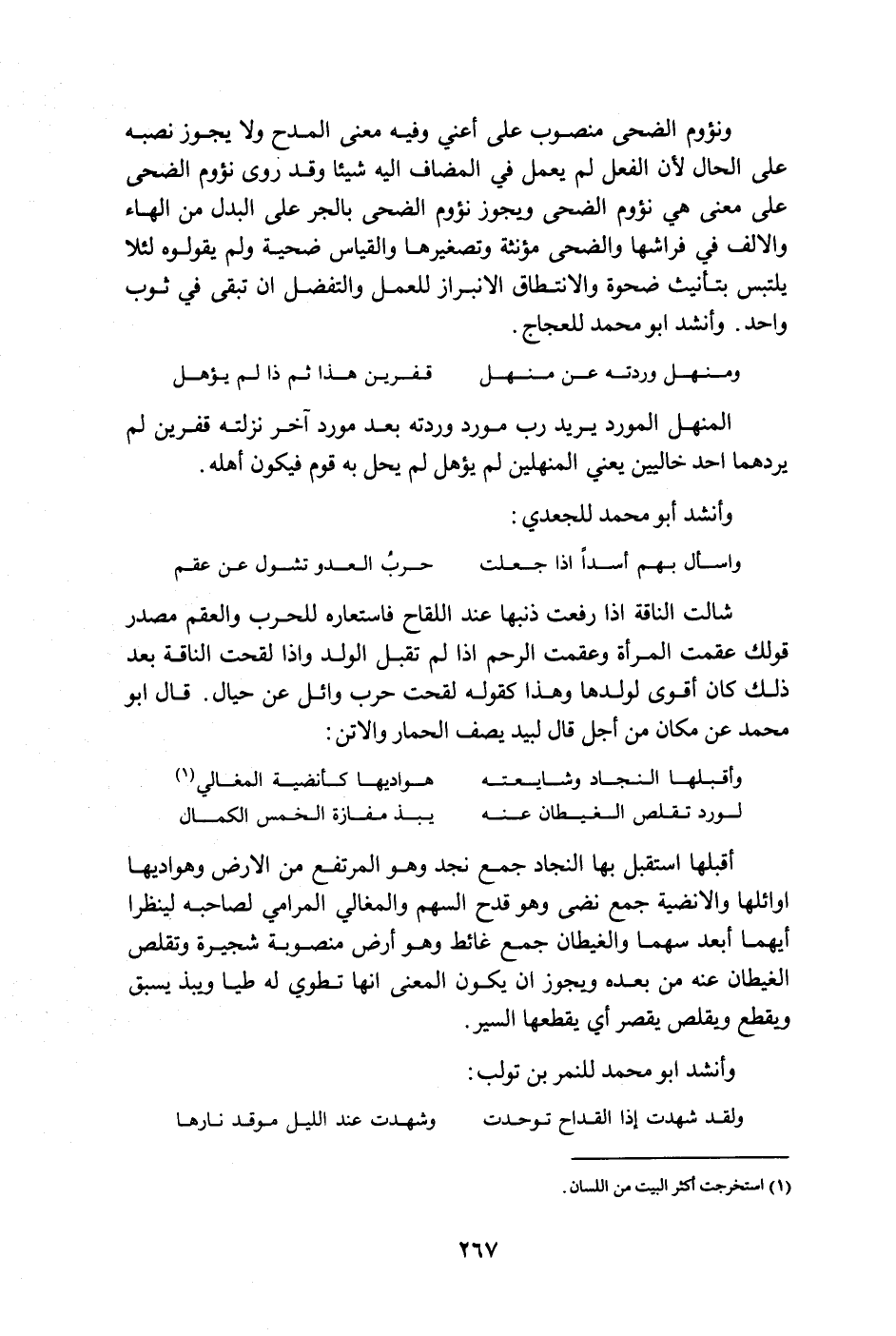 ونؤوم الضحى منصوب على أعني وفيه معنى المدح ولا يجوز نصبه على الحال لأن الفعل لم يعمل في المضاف إليه شيئا وقد روى نؤوم الضحى على معنى هي نؤوم الضحى ويجوز نؤوم الضحى بالجر على البدل من الهاء والألف في فراشها والضحى مؤنثة وتصغيرها والقياس ضحية ولم يقولوه لئلا يلتبس بتأنيث ضحوة والانتطاق الانبراز للعمل والتفضل أن تبقى في ثوب واحد. وأنشد أبو محمد للعجاج.