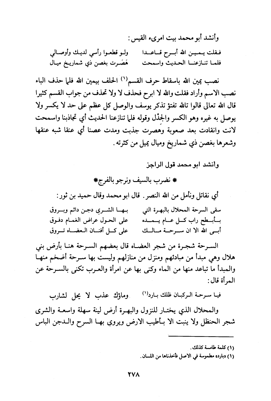 السرحة شجرة من شجر العضاه قال بعضهم السرحة هنا بأرض بني هلال وهي مبدأ من مبادئهم ومنزل من منازلهم وليست بها سرحة أضخم منها والمبدأ ما تباعد منها من الماء وكنى بها عن امرأة والعرب تكنى بالسرحة عن المرأة قال: