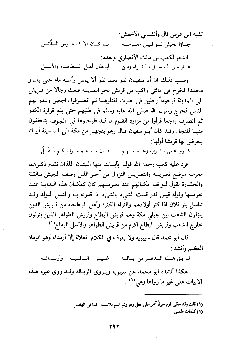 فرد عليه كعب رحمه الله قوله بأبيات منها البيتان اللذان تقدم ذكرهما معرسه موضع تعريسه والتعريس النزول من آخر الليل وصف الجيش بالقلة والحقارة يقول لو قدر مكانهم عند تعريسهم كان كمكان هذه الدابة عند تعريسها وقوله قيس قدر قست الشيء بالشيء إذا قدرته به والنسل الولد وقد تناسل بنو فلان إذا كثر أولادهم والثراء الكثرة وأهل البطحاء من قريش الذين ينزلون الشعب بين جبلي مكة وهم قريش البطاح وقريش الظواهر الذين ينزلون خارج الشعب وقريش البطاح أكرم من قريش الظواهر والأسل الرماح.