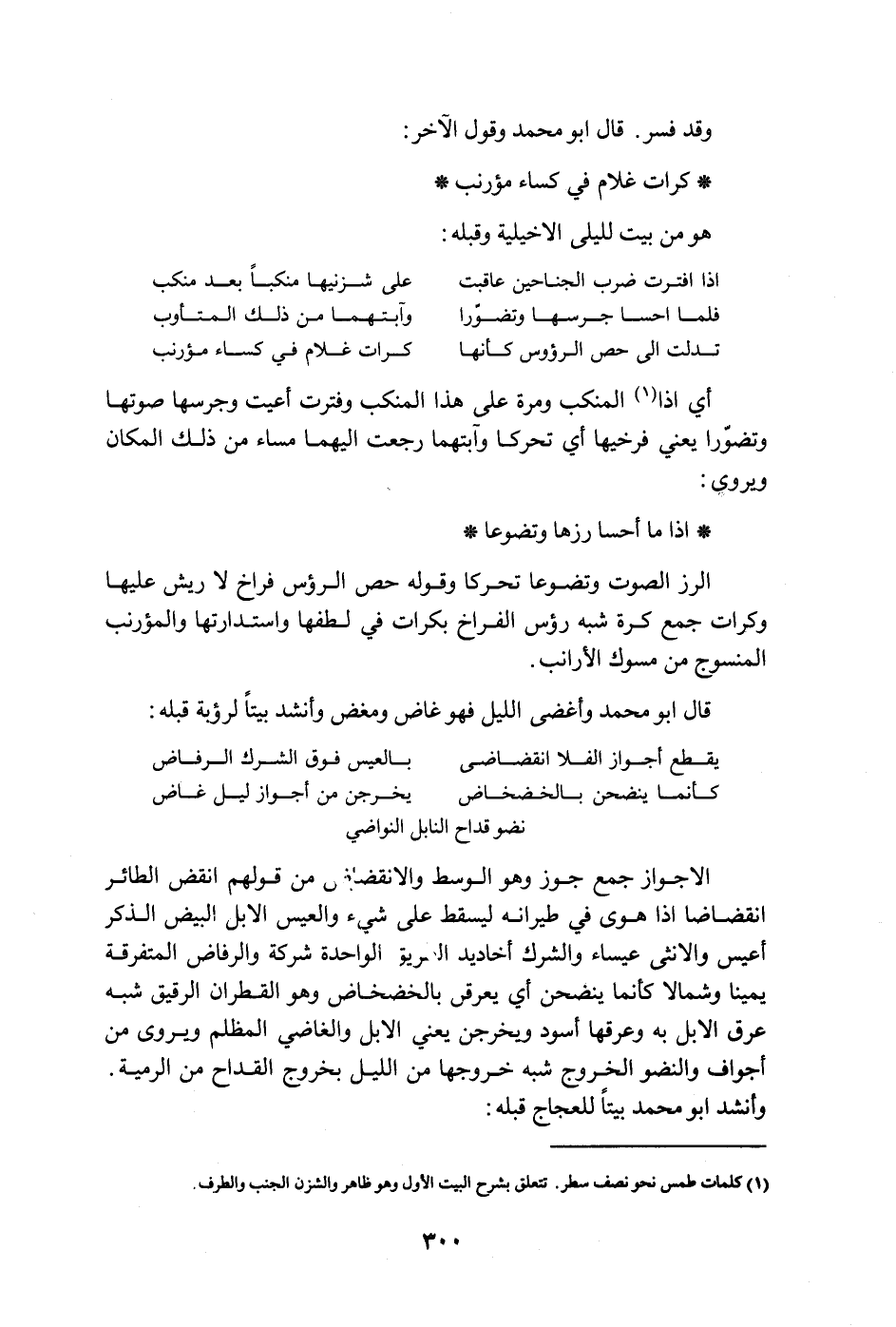 الأجواز جمع جوز وهو الوسط والانقضاض من قولهم انقض الطائر انقضاضا إذا هوى في طيرانه ليسقط على شيء والعيس الإبل البيض الذكر أعيس والأنثى عيساء والشرك أخاديد الطريق الواحدة شركة والرفاض المتفرقة يمينا وشمالا كأنما ينضحن أي يعرقن بالخضخاض وهو القطران الرقيق شبه عرق الإبل به وعرقها أسود ويخرجن يعني الإبل والغاضي المظلم ويروى من أجواف والنضو الخروج شبه خروجها من الليل بخروج القداح من الرمية. وانشد أبو محمد بيتاً للعجاج قبله: