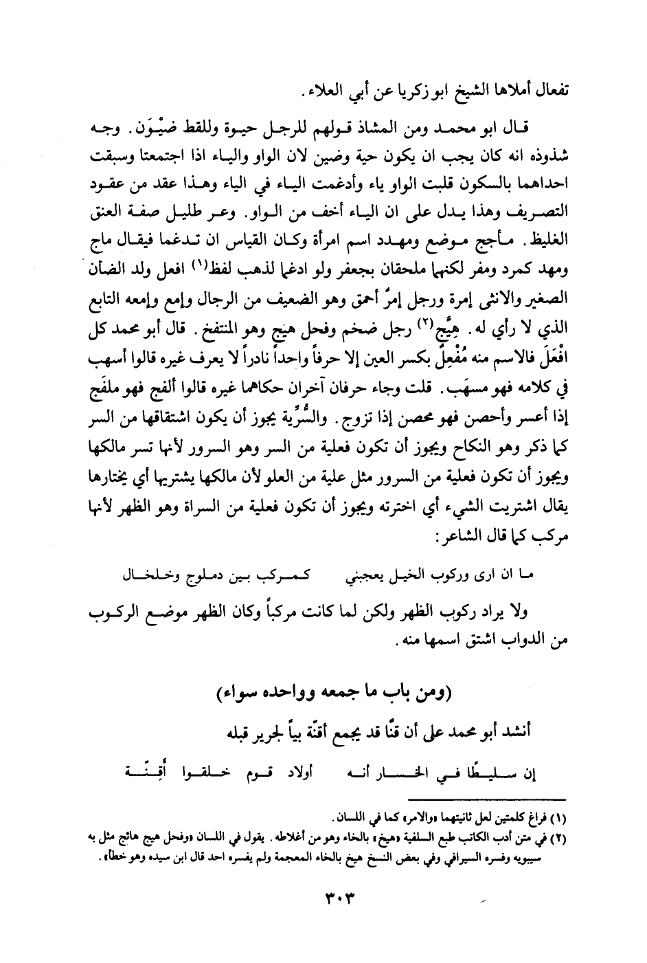 قال أبو محمد ومن المشاذ قولهم للرجل حيوة وللقط ضيون. وجه شذوذه أنه كان يجب أن يكون حية وضين لأن الواو والياء إذا اجتمعتا وسبقت إحداهما بالسكون قلبت الواو ياء وادغمت الياء في الياء وهذا عقد من عقود التصريف وهذا يدل على أن الياء أخف من الواو. وعر طليل صفة العنق الغليظ. مأجج موضع ومهدد اسم امرأة وكان القياس أن تدغما فيقال ماج ومهد كمرد ومفر لكنهما ملحقان بجعفر ولو أدغما لذهب لفظ أفعل ولد الضأن الصغير والأنثى إمرة ورجل إمرٌ أحمق وهو الضعيف من الرجال وإمع وإمعه التابع الذي لا رأي له. هيّج رجل ضخم وفحل هيج وهو المنتفخ قال أبو محمد كل أفعل فالاسم منه مفعل بكسر العين إلا حرفاً واحداً نادراً لا يعرف غيره قالوا أسهب في كلامه فهو مسهب. قلت وجاء حرفان آخران حكاهما غيره قالوا ألفج فهو ملفج إذا أعسر وأحصن فهو محصن إذا تزوج. والسّرّية يجوز أن يكون اشتقاقها من السر كما ذكر وهو النكاح ويجوز أن تكون فعلية من السر وهو السرور لأنها تسر مالكها ويجوز أن تكون فعلية من السرور مثل علية من العلو لأن مالكها يشتريها أي يختارها يقال اشتريت الشيء أي اخترته ويجوز أن تكون فعلية من السراة وهو الظهر لأنها مركب كما قال الشاعر: