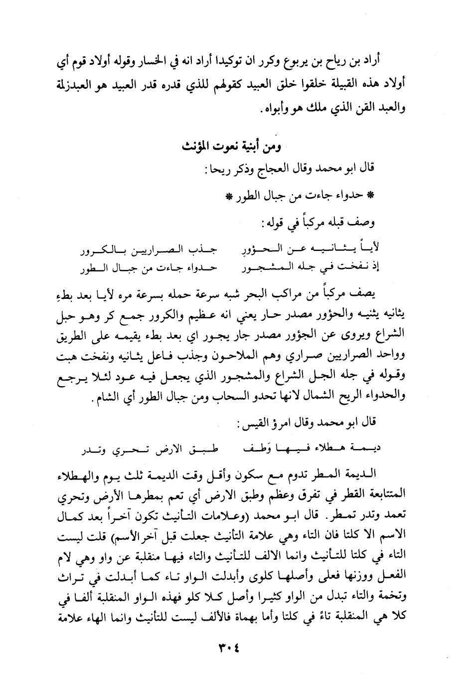 الديمة المطر تدوم مع سكون وأقل وقت الديمة ثلث يوم والهطلاء المتتابعة القطر في تفرق وعظم وطبق الأرض أي تعم بمطرها الأرض وتحري تعمد وتدر تمطر. قال أبو محمد " وعلامات التأنيث تكون آخراً بعد كمال الاسم إلا كلتا فإن التاء وهي علامة التأنيث جعلت قبل آخر الاسم " قلت ليست التاء في كلتا للتانيث وإنما الألف للتأنيث والتاء فيها منقلبة عن واو وهي لام الفعل ووزنها فعلى وأصلها كلوى وأبدلت الواو تاء كما أبدلت في تراث وتخمة والتاء تبدل من الواو كثيراً وأصل كلا كلو فهذه الواو المنقلبة ألفاً في كلا هي المنقلبة تاءً في كلتا وأما بهماة فالألف ليست للتأنيث وإنما الهاء علامة