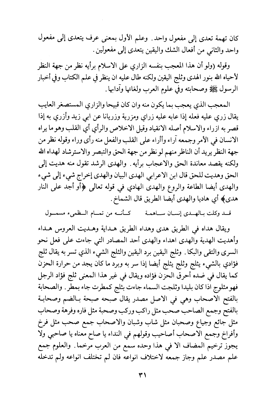 المعجب الذي يعجب بما يكون منه وأن كان قبيحا والزاري المستصغر العايب يقال زري عليه فعله إذا عابه عليه زاري ومزرية وزريانا عن أبي زيد وأزري به إذا قصر به إزراء والإسلام أصله الانقياد وقيل الإخلاص والرأي أي القلب وهو ما يراه الإنسان في الأمر وجمعه آراء وأراء على القلب والفعل منه رأى وراء وقوله نظر من جهة النظر يريد أن الناظر منهم لو نظر من جهة الحق والتبصر والاسترشاد لهداه الله ولكنه يقصد معاندة الحق والإعجاب برأيه. والهدى الرشد تقول منه هديت إلى الحق وهديت للحق قال ابن الإعرابي الهدى إخراج شيء إلى شيء والهدى أيضا الطاعة والروع والهدى الهادي في قوله تعالى " أو أجد على النار هدى " أي هاديا والهدى أيضا الطريق قال الشماخ.