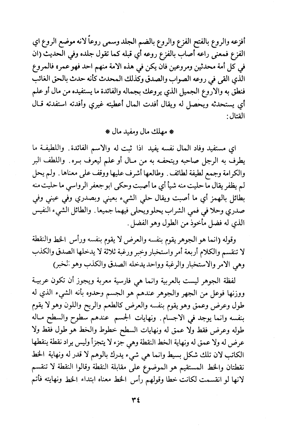 لفظة الجوهر ليست بالعربية وإنما هي فارسية معربة ويجوز أن تكون عربية ووزنها فوعل من الجهر والجوهر عندهم هو الجسم وحدوه بأنه الشيء الذي له طول وعرض وعمق وهو يقوم بنفسه والعرض كالطعم والريح واللون وهو لا يقوم بنفسه وإنما يوجد في الأجسام. ونهايات الجسم عندهم سطوح والسطح ماله طوله وعرض فقط ولا عمق له ونهايات السطح خطوط والخط هو طول فقط ولا عرض له ولا عمق له ونهاية الخط النقطة وهي جزء لا يتجزأ وليس يراد نقطة ينقطها الكاتب لأن تلك شكل بسيط وإنما هي شيء يدرك بالوهم لا قدر له ونهاية الخط نقطتان والخط المستقيم هو الموضوع على مقابلة النقطة وقالوا النقطة لا تنقسم لأنها لو انقسمت لكانت خطا وقولهم رأس الخط معناه ابتداء الخط ونهايته فأتم
