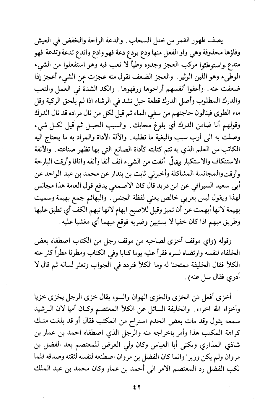 وقوله " واي موقف أخزى لصاحبه من موقف رجل من الكتاب اصطفاه بعض الخلفاء لنفسه وارتضاه لسره فقرأ عليه يوما كتابا وفي الكتاب ومطرنا مطراً كثر عنه الكلأ فقال الخليفة ممتحنا له وما الكلأ فتردد في الجواب وتعثر لسانه ثم قال لا أدري فقال سل عنه ".