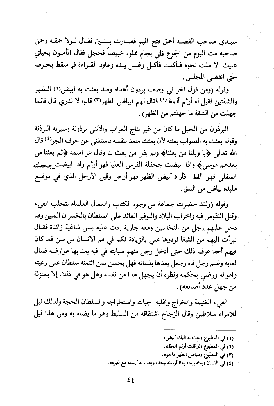 وقوله " ولقد حضرت جماعة من وجوه الكتاب والعمال والعلماء بتحلب الفيء وقتل النفوس فيه وإخراب البلاد والتوفير العائد على السلطان بالخسران المبين وقد دخل عليهم رجل من النخاسين ومعه جارية ردت عليه بسن شاغية زائدة فقال تبرأت إليهم من الشغا فردوها علي بالزيادة فكم في فم الإنسان من سن فما كان فيهم أحد عرف ذلك حتى أدخل رجل منهم سبابته في فيه يعد بها عوارضه فسال لعابه وضم رجل فاه وجعل يعدها بلسانه فهل يحسن بمن ائتمنه سلطان على رعيته وأمواله ورضي بحكمه ونظره أن يجهل هذا من نفسه وهل هو في ذلك إلا بمنزلة من جهل عدد أصابعه ".