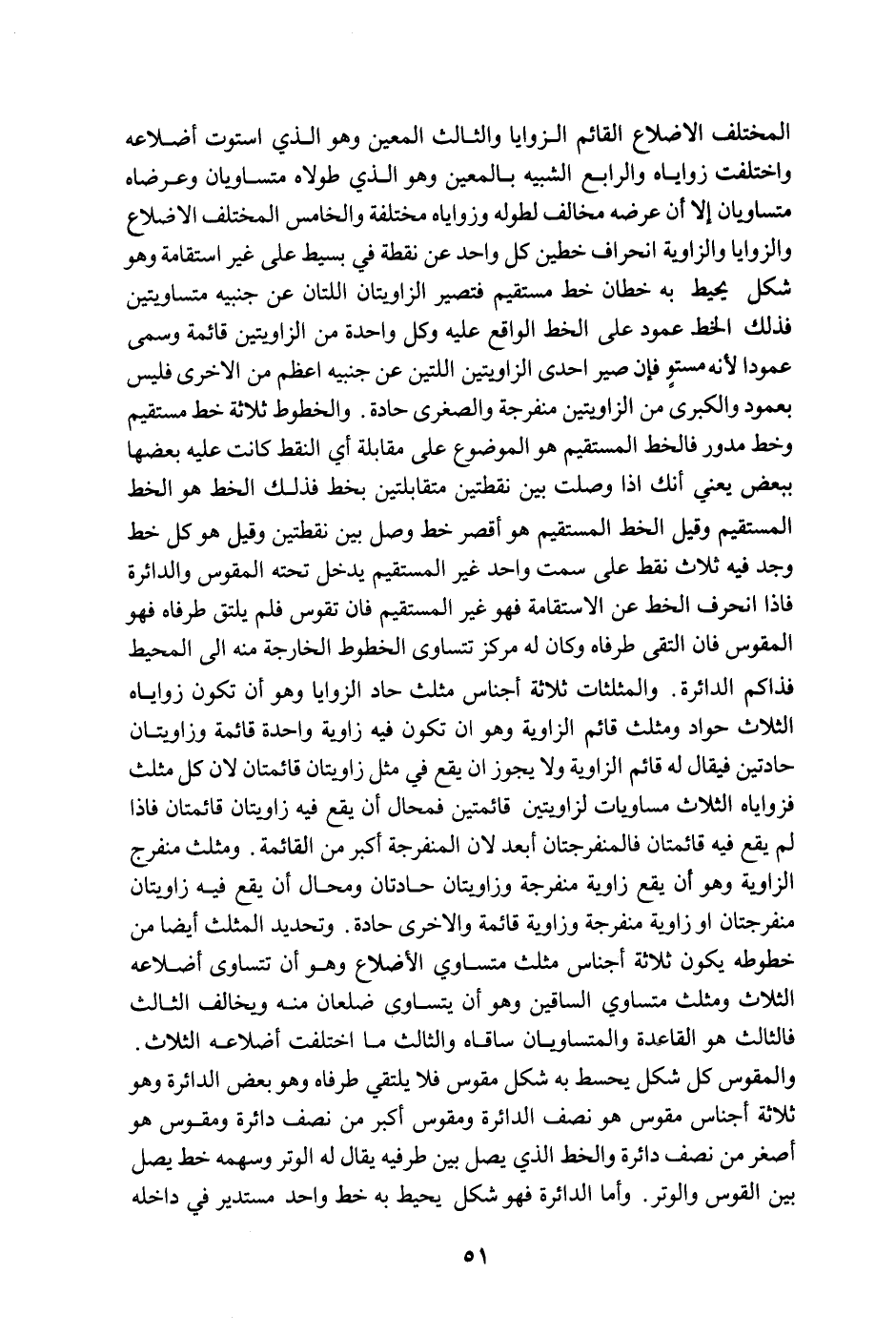 المختلف الأضلاع القائم الزوايا والثالث المعين وهو الذي استوت أضلاعه واختلفت زواياه والرابع الشبيه بالمعين وهو الذي طولاه متساويان وعرضاه متساويان إلا أن عرضه مخالف لطوله وزواياه مختلفة والخامس المختلف الأضلاع والزوايا والزاوية انحراف خطين كل واحد عن نقطة في بسيط على غير استقامة وهو شكل يحيط به خطان خط مستقيم فتصير الزاويتان اللتان عن جنبيه متساويتين فذلك الخط عمود على الحظ الواقع عليه وكل واحدة من الزاويتين قائمة وسمى عمودا لأنه مستوٍ فإن صير إحدى الزاويتين اللتين عن جنبيه أعظم من الأخرى فليس بعمود والكبرى من الزاويتين منفرجة والصغرى حادة. والخطوط ثلاثة خط مستقيم وخط مدور فالخط المستقيم هو الموضوع على مقابلة أي النقط كانت عليه بعضها ببعض يعني أنك إذا وصلت بين نقطتين متقابلتين بخط فذلك الخط هو الخط المستقيم وقيل الخط المستقيم هو أقصر خط وصل بين نقطتين وقيل هو كل خط وجد فيه ثلاث نقط على سمت واحد غير المستقيم يدخل تحته المقوس والدائرة فإذا انحرف الخط عن الاستقامة فهو غير المستقيم فإن تقوس فلم يلتق طرفاه فهو المقوس فإن التقى طرفاه وكان له مركز تتساوى الخطوط الخارجة منه إلى المحيط فذاكم الدائرة. والمثلثات ثلاثة أجناس مثلث حاد الزوايا وهو أن تكون زواياه الثلاث حواد ومثلث قائم الزاوية وهو أن تكون فيه زاوية واحدة قائمة وزاويتان حادتين فيقال له قائم الزاوية ولا يجوز أن يقع في مثل زاويتان قائمتان لأن كل مثلث فزواياه الثلاث مساويات لزاويتين قائمتين فمحال أن يقع فيه زاويتان قائمتان فإذا لم يقع فيه قائمتان فالمنفرجتان أبعد لأن المنفرجة أكبر من القائمة. ومثلث منفرج الزاوية وهو أن يقع زاوية منفرجة وزاويتان حادتان ومحال أن يقع فيه زاويتان منفرجتان أو زاوية منفرجة وزاوية قائمة والأخرى حادة. وتحديد المثلث أيضا من خطوطه يكون ثلاثة أجناس مثلث متساوي الأضلاع وهو أن تتساوى أضلاعه الثلاث ومثلث متساوي الساقين وهو أن يتساوى ضلعان منه ويخالف الثالث فالثالث هو القاعدة والمتساويان ساقاه والثالث ما اختلفت أضلاعه الثلاث. والمقوس كل شكل يحسط به شكل مقوس فلا يلتقي طرفاه وهو بعض الدائرة وهو ثلاثة أجناس مقوس هو نصف الدائرة ومقوس أكبر من نصف دائرة ومقوس هو أصغر من نصف دائرة والخط الذي يصل بين طرفيه يقال له الوتر وسهمه خط يصل بين القوس والوتر. وأما الدائرة فهو شكل يحيط به خط واحد مستدير في داخله