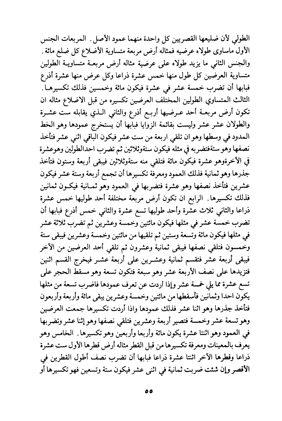 عشر في عشرة فيكون مائة فقد بان أن ضرب الضلعين ساوى مبلغه مبلغ ضرب الضلع الطولي. وهذا الضرب من المثلثات هو نصف المربعة ولها عمود يقع على ضلعها الطولي لأن ضلعيهما القصريين كل واحدة منهما عمود الأصل. المربعات الجنس الأول ما ساوى طولاه عرضيه فمثاله أرض مربعة متساوية الأضلاع كل ضلع مائة. والجنس الثاني ما يزيد طولاه على عرضيه مثاله أرض مربعة متساوية الطولين متساوية العرضين كل طول منها خمس عشرة ذراعا وكل عرض منها عشرة أذرع فبابها أن تضرب خمسة عشر في عشرة فيكون مائة وخمسين فذلك تكسيرها. الثالث المتساوي الطولين المختلف العرضين تكسيره من قبل الإضلاع مثاله أن تكون أرض مربعة أحد عرضيها أربع أذرع والثاني الذي يقابله ست عشرة والطولان عشر عشر وليست بقائمة الزوايا فبابها أن يستخرج عمودها وهو الخط الممدود في وسطها وهو أن تلقي أربعة من ست عشر فيكون الباقي اثني عشر فتأخذ نصفها وهو ستة فتضربه في مثله فيكون ستة فتضربه في مثله فيكون ستة وثلاثين ثم تضرب أحد الطولين وهو عشرة في الآخرة وهو عشرة فيكون مائة فتلقي منه ستة وثلاثين فيبقى أربعة وستون فتأخذ جذرها وهو ثمانية فذلك العمود ومعرفة تكسيرها أن تجمع أربعة وستة عشر فيكون عشرين فتأخذ نصفها وهو عشرة فتضربها في العمود وهو ثمانية فيكون ثمانين فذلك تكسيرها. الرابع أن تكون أرض مربعة مختلفة أحد طوليها خمس عشرة ذراعا والثاني ثلاث عشرة وأحد طوليها تسع عشرة والثاني خمس أذرع فبابها أن تضرب خمسة عشر في مثلها فيكون مائتين وخمسة وعشرين ثم تضرب ثلاثة عشر في مثلها فيكون مائة وتسعة وستين ثم تلقيها من مائتين وخمسة وعشرين فيبقى ستة وخمسون فتلقي نصفها فيبقى ثمانية وعشرون ثم تلقي أحد العرضين من الآخر فيبقى أربعة عشر فتقسم ثمانية وعشرين على أربعة عشر فيخرج القسم اثنتين فتزيدها على نصف الأربعة عشر وهو سبعة فتكون تسعة وهو مسقط الحجر على تسع عشرة مما يلي خمسة عشر وإذا اردت عن تعرف عمودها فاضرب تسعة من مثلها يكون أحدا وثمانين فأسقطها من مائتين وخمسة وعشرين يبقى مائة وأربعة وأربعون فتأخذ جذرها وهو اثنا عشر فذلك عمودها وإذا أردت تكسيرها جمعت العرضين وهو تسعة عشر وخمسة فتصير أربعة وعشرين فتلقي نصفها وهو اثنا عشر وتضربها في العمود وهو اثنتا عشرة يكون مائة وأربعا وأربعين وهو تكسيرها. الخامس وهو يعرف بالمعنيات ومعرفة تكسيرها من قبل القطر مثاله أرض قطرها الأول ست عشرة ذراعا وقطرها الآخر اثنتا عشرة ذراعا فبابها أن تضرب نصف أطول القطرين في الأقصر وإن شئت ضربت ثمانية في اثنى عشر فيكون ستة وتسعين فهو تكسيرها أو