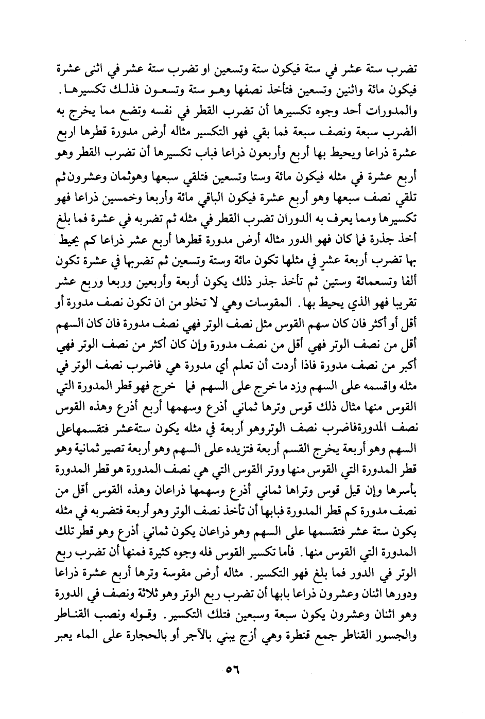 تضرب ستة عشر في ستة فيكون ستة وتسعين أو تضرب ستة عشر في اثنى عشرة فيكون مائة واثنين وتسعين فتأخذ نصفها وهو ستة وتسعون فذلك تكسيرها. والمدورات أحد وجوه تكسيرها أن تضرب القطر في نفسه وتضع مما يخرج به الضرب سبعة ونصف سبعة فما بقي فهو التكسير مثاله أرض مدورة قطرها أربع عشرة ذراعا ويحيط بها أربع وأربعون ذراعا فباب تكسيرها أن تضرب القطر وهو أربع عشرة في مثله فيكون مائة وستا وتسعين فتلقي سبعها وهو ثمان وعشرون ثم تلقي نصف سبعها وهو أربع عشرة فيكون الباقي مائة وأربعا وخمسين ذراعا فهو تكسيرها ومما يعرف به الدوران تضرب القطر في مثله ثم تضربه في عشرة فما بلغ أخذ جذرة فما كان فهو الدور مثاله أرض مدورة قطرها أربع عشر ذراعا كم يحيط بها تضرب أربعة عشر في مثلها تكون مائة وستة وتسعين ثم تضربها في عشرة تكون ألفا وتسعمائة وستين ثم تأخذ جذر ذلك يكون أربعة وأربعين وربعا وربع عشر تقريبا فهو الذي يحيط بها. المقوسات وهي لا تخلو من أن تكون نصف مدورة أو أقل أو أكثر فإن كان سهم القوس مثل نصف الوتر فهي نصف مدورة فإن كان السهم أقل من نصف الوتر فهي أقل من نصف مدورة وإن كان أكثر من نصف الوتر فهي أكبر من نصف مدورة فإذا أردت أن تعلم أي مدورة هي فاضرب نصف الوتر في مثله وأقسمه على السهم وزد ما خرج على السهم فما خرج فهو قطر المدورة التي القوس منها مثال ذلك قوس وترها ثماني أذرع وسهمها أربع أذرع وهذه القوس نصف المدورة فاضرب نصف الوتر وهو أربعة في مثله يكون ستة عشر فتقسمها على السهم وهو أربعة يخرج القسم أربعة فتزيده على السهم وهو أربعة تصير ثمانية وهو قطر المدورة التي القوس