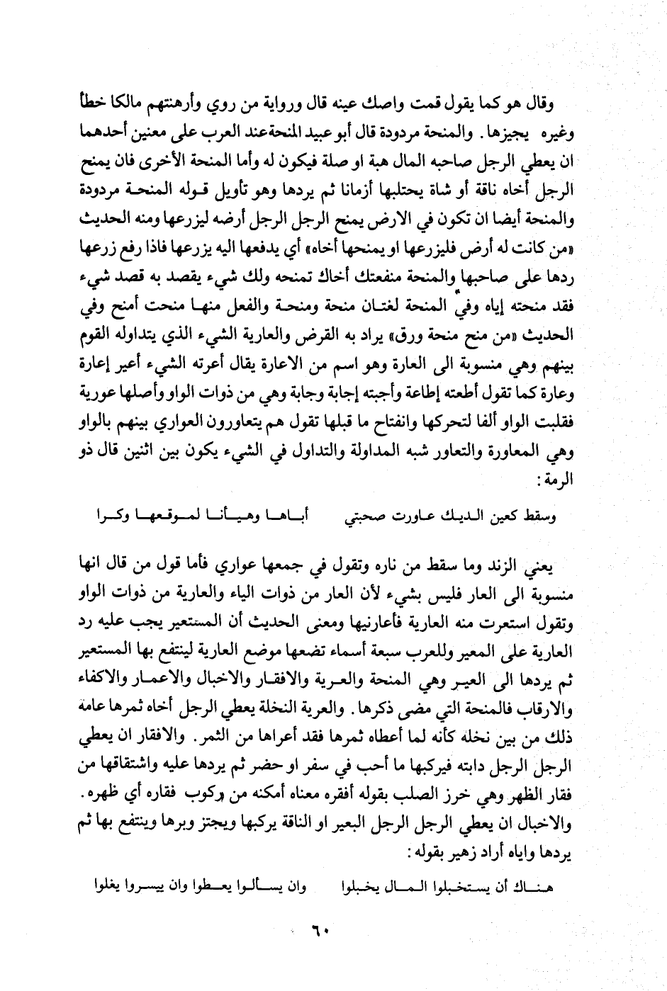 وقال هو كما يقول قمت واصك عينه قال ورواية من روي وأرهنتهم مالكا خطأ وغيره يجيزها. والمنحة مردودة قال أبو عبيد المنحة عند العرب على معنين أحدهما أن يعطي الرجل صاحبه المال هبة أو صلة فيكون له وأما المنحة الأخرى فان يمنح الرجل أخاه ناقة أو شاة يحتلبها أزمانا ثم يردها وهو تأويل قوله المنحة مردودة والمنحة أيضا أن تكون في الأرض يمنح الرجل الرجل أرضه ليزرعها ومنه الحديث " من كانت له أرض فليزرعها أو يمنحها أخاه " أي يدفعها إليه يزرعها فإذا رفع زرعها ردها على صاحبها والمنحة منفعتك أخاك تمنحه ولك شيء يقصد به قصد شيء فقد منحته إياه وفي المنحة لغتان منحة ومنحة والفعل منها منحت أمنح وفي الحديث " من منح منحة ورق " يراد به القرض والعارية الشيء الذي يتداوله القوم بينهم وهي منسوبة إلى العارة وهو اسم من الإعارة يقال أعرته الشيء أعير إعارة وعارة كما تقول أطعته إطاعة وأجبته إجابة وجابة وهي من ذوات الواو وأصلها عورية فقلبت الواو ألفا لنحركها وانفتاح ما قبلها تقول هم يتعاورون العواري بينهم بالواو وهي المعاورة والتعاور شبه المداولة والتداول في الشيء يكون بين اثنين قال ذو الرمة: