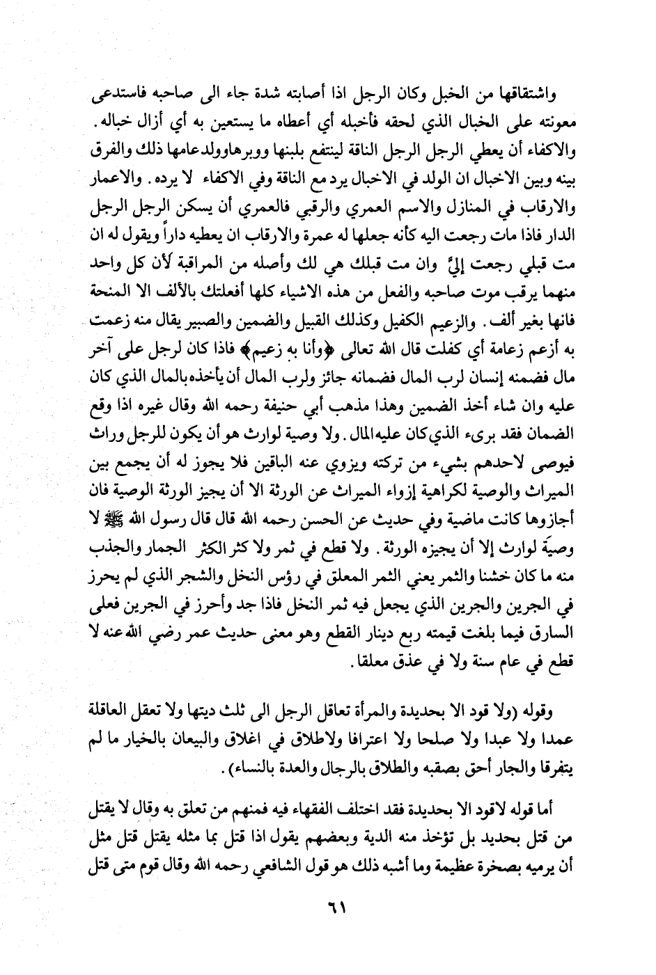 واشتقاقها من الخبل وكان الرجل إذا أصابته شدة جاء إلى صاحبه فاستدعى معونته على الخبال الذي لحقه فأخبله أي أعطاه ما يستعين به أي أزال خباله. والإكفاء أن يعطي الرجل الناقة لينتفع بلبنها ووبرها وولد عامها ذلك والفرق بينه وبين الأخبال أن الولد في الأخبال يرد مع الناقة وفي الإكفاء لا يرده. والإعمار والأقارب في المنازل والاسم العمري والرقبي فالعمري فالعمري أن يسكن الرجل الرجل الدار فإذا مات رجعت إليه كأنه جعلها له عمرة والأقارب أن يعطيه داراً ويقول له أن مت قبلي رجعت إليّ وإن مت قبلك هي لك وأصله من المراقبة لأن كل واحد منهما يرقب موت صاحبه والفعل من هذه الأشياء كلها أفعلتك بالألف إلا المحنة فإنها بغير ألف. والزعيم الكفيل وكذلك القبيل والضمين والصبير يقال منه زعمت به أزعم زعامة أي كفلت قال الله تعالى " وأنا به زعيم " فإذا كان لرجل على آخر مال فضمنه إنسان لرب المال فضمانه جائز ولرب المال أن يأخذه بالمال الذي كان عليه وإن شاء أخذ الضمين وهذا مذهب أبي حنيفة رحمه الله وقال غيره إذا وقع الضمان فقد برئ الذي كان عليه المال. ولا وصية لوارث هو أن يكون للرجل وراث فيوصى لأحدهم بشيء من تركته ويزوي عنه الباقين فلا يجوز له أن يجمع بين الميراث والوصية لكراهية إزواء الميراث عن الورثة إلا أن يجيز الورثة الوصية فإن أجازوها كانت ماضية وفي حديث عن الحسن رحمه الله قال قال رسول الله صلى الله عليه وسلم لا وصية لوارث إلا أن يجيزه الورثة. ولا قطع في ثمر ولا كثر الكثر الجمار والجذب منه ما كان خشنا والثمر يعني الثمر المعلق في رؤوس النخل والشجر الذي لم يحرز في الجرين والجرين الذي يجعل فيه ثمر النخل فإذا جد وأحرز في الجرين فعلى السارق فيما بلغت قيمته ربع دينار القطع وهو معنى حديث عمر رضي الله عنه لا قطع في عام سنة ولا في عذق معلقا.