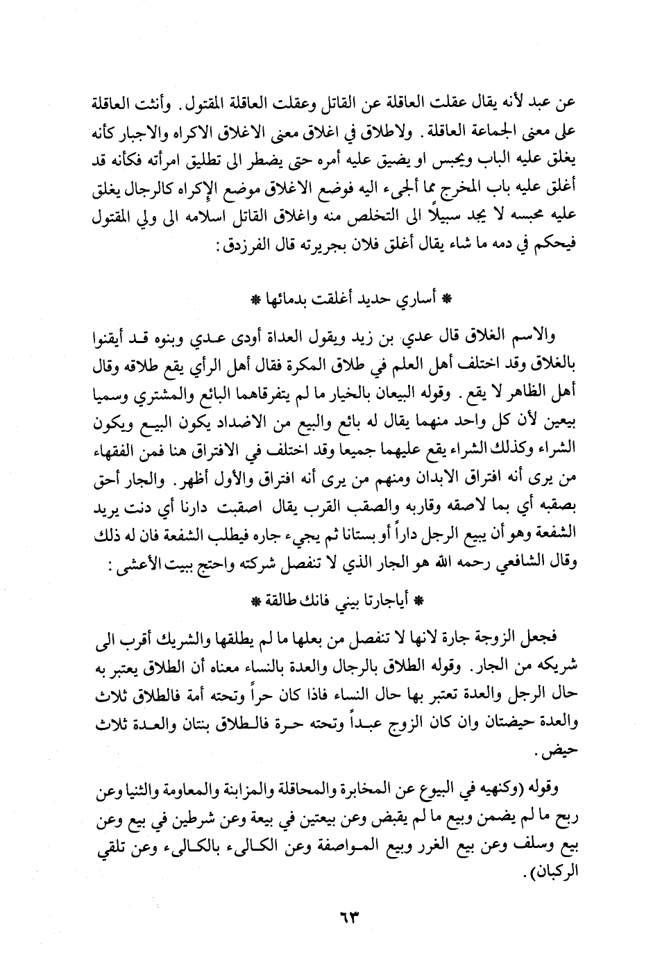 عن عبد لأنه يقال عقلت العاقلة عن القاتل وعقلت العاقلة المقتول. وأنثت العاقلة على معنى الجماعة العاقلة. ولإطلاق في إغلاق معنى الإغلاق الإكراه والإجبار كأنه يغلق عليه الباب ويحبس أو يضيق عليه أمره حتى يضطر إلى تطليق امرأته فكأنه قد أغلق عليه باب المخرج مما ألجئ إليه فوضع الإغلاق موضع الإكراه كالرجال يغلق عليه محبسه لا يجد سبيلاً إلى التخلص منه وإغلاق القاتل إسلامه إلى ولي المقتول فيحكم في دمه ما شاء يقال أغلق فلان بجريرته قال الفرزدق: