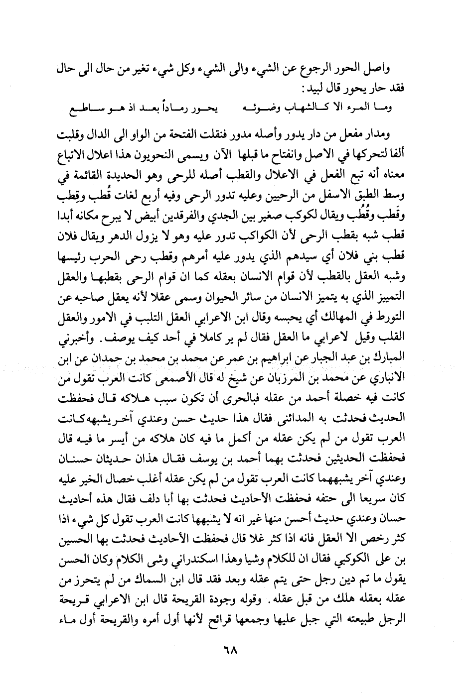 ومدار مفعل من يدور وأصله مدور فنقلت الفتحة من الواو إلى الدال وقلبت ألفا لتحركها في الأصل وانفتاح ما قبلها الآن ويسمى النحويون هذا إعلال الإتباع معناه أنه تبع الفعل في الإعلال والقطب أصله للرحى وهو الحديدة القائمة في وسط الطبق الأسفل من الرحيين وعليه تدور الرحى وفيه أربع لغات قطب وقطب وقطب وقطب ويقال لكوكب صغير بين الجدي والفرقدين أبيض لا يبرح مكانه أبدا قطب شبه بقطب الرحى لأن الكواكب تدور عليه وهو لا يزول الدهر ويقال فلان قطب بني فلان أي سيدهم الذي يدور عليه أمرهم وقطب رحى الحرب رئيسها وشبه العقل بالقطب لأن قوام الإنسان بعقله كما أن قوام الرحى بقطبها والعقل التمييز الذي به يتميز الإنسان من سائر الحيوان وسمى عقلا لأنه يعقل صاحبه عن التورط في المهالك أي يحسبه وقال ابن الأعرابي العقل التلبب في الأمور والعقل القلب وقيل لاعرابي ما العقل فقال لم ير كاملا في أحد كيف يوصف. وأخبرني المبارك بن عبد الجبار عن إبراهيم بن عمر عن محمد بن محمد بن حمدان عن ابن الأنباري عن محمد بن المرزبان عن شيخ له قال الأصمعي كانت العرب تقول من كانت فيه خصلة أحمد من عقله فبالحرى أن تكون سبب هلاكه قال فحفظت الحديث فحدثت به المدائنى فقال هذا حديث حسن وعندي آخر يشبهه كانت العرب تقول من لم يكن عقله من أكمل ما فيه كان هلاكه من أيسر ما فيه قال فحقظت الحدثيين فحدثت بهما أحمد بن يوسف فقال هذان حديثان حسنان وعندي آخر لا يشبههما كانت العرب تقول من لك يكن عقله أغلب خصال الخير عليه كان سريعا إلى حتفه فحفظت الأحاديث فحدثت بها أبا دلف فقال هذه الأحاديث حسان عندي حديث أحسن منها غير أنه لا يشسبهها كانت العرب تقول كل شيء إذا كثر رخص إلا العقل فأنه إذا كثر غلا قال فحفظت الأحاديث فحدثت بها الحسين بن على الكوكبي فقال أن للكلام وشيا وهذا اسكندراني وشى الكلام وكان الحسن يقول ما تم دين رجل حتى يتم عقله وبعد فقد قال ابن السماك من لم يتحرز من عقله بعقله هلك من قبل عقله. وقوله وجودة القريحة قال ابن الأعرابي قريحة الرجل طبييعته التي جبل عليها وجمعها قرائح لأنها أول أمره والقريحة أول ماء