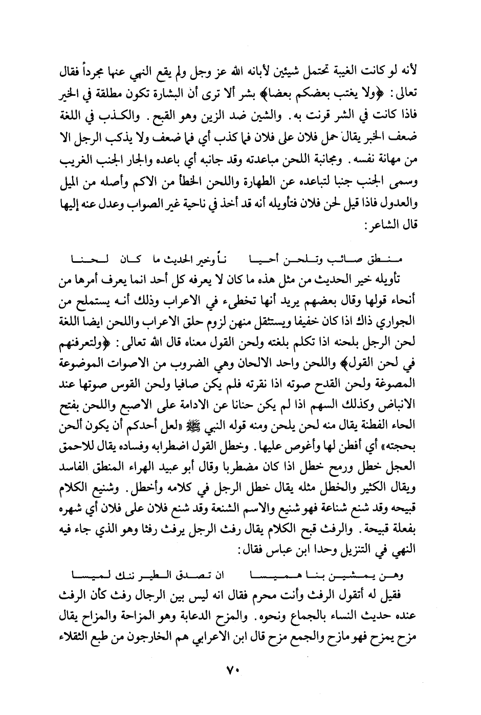 لأنه لو كانت الغيبة تحتمل شيئين لأبانه الله عز وجل ولم يقع النهي عنها مجرداً فقال تعالى: " ولا يغتب بعضكم بعضا " بشر ألا ترى البشارة تكون مطلقة في الخير فإذا كانت في الشر قرنت به. والشين ضد الزين وهو القبح. والكذب في اللغة ضعف الخبر يقال حمل فلان على فلان فما كذب أي فما ضعف ولا يذكب الرجل الا من مهانة نفسه. ومجانبة اللحن مباعدته وقد جانبه أي باعده والجار الجنب الغريب وسمى الجنب جنباً لتباعده عن الطهارة واللحن الخطأ من الأكم وأصله من الميل والعدول فإذا قيل لحن فلان فتأويله أنه قد أخذ في ناحية غير الصواب وعدل عنه إليها قال الشاعر: